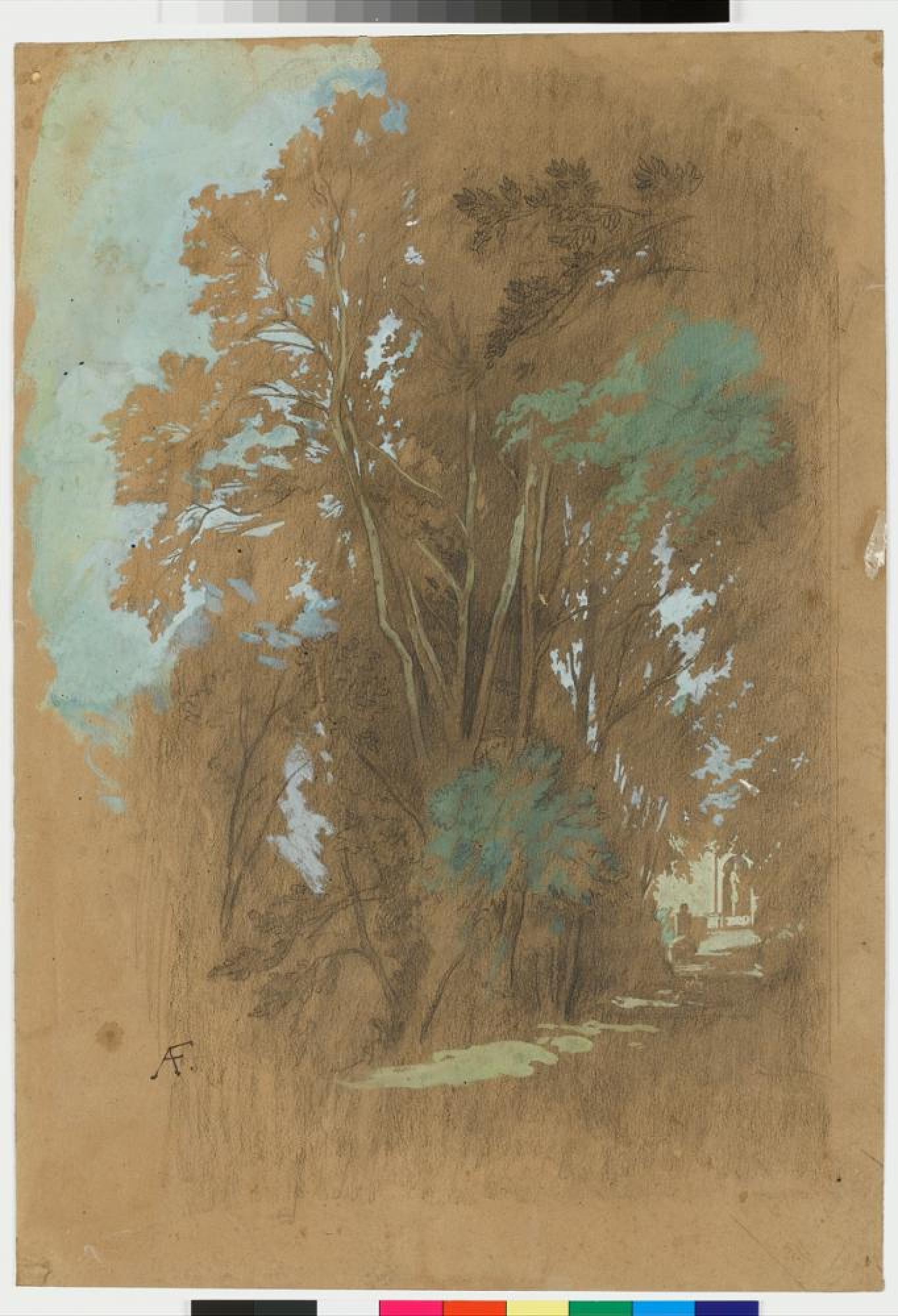 Die Villa d'Este in Tivoli war ein beliebtes und von den deutschen Künstlern in Rom bevorzugtes Bildmotiv. Anselm Feuerbachs Zeichnung nach der Natur entstand 1857 auf einer Sommerreise. Ein raffinierter Kunstgriff in diesem Blatt zeigt sich darin, wie Feuerbach es versteht, das braune Tonpapier als Grund auszunutzen, auf dem er dann seinen Landschaftsausschnitt ausbreitet und diesen zum Blattrand hin - scheinbar zufällig - auslaufen lässt. Höhungen in Blau-, Grün- und Gelbtönen dienen der effektvollen Auslotung der Licht- und Schatten-Kontraste.