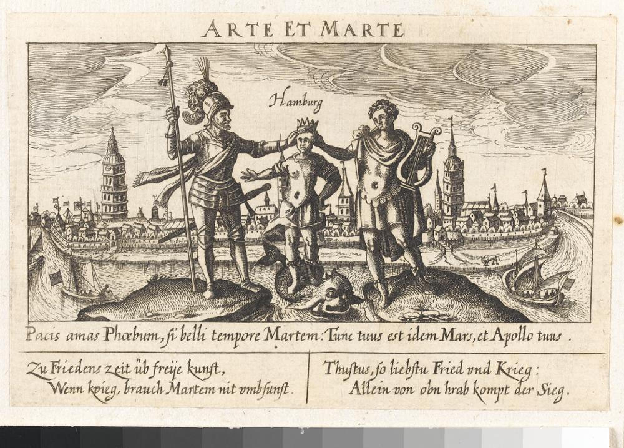 Unter dem Motto ARTE ET MARTE, das mit der Redewendung »Durch Kunstfertigkeit und Kampf« übersetzt werden kann, erscheinen die Götter Mars und Phoebus auf einer Erdscholle stehend vor der Stadtansicht von Hamburg. Standfest und unverrückbar präsentiert sich der Gott des Krieges, leichtfüßiger und bewegter der Gott der Künste. Wie die Verse erläutern, verkörpern Phoebus und Mars jene beiden Gebiete, auf denen ein König, hier repräsentiert durch einen jungen Mann in der Mitte des Bildes, zu Ruhm und Ehre gelangen kann. Die Formulierung des Ideals Arte et Marte ist das Ergebnis einer im 15. und 16. Jahrhundert lebhaft geführten Debatte über die Grundlagen einer guten Regierung, die ihre Brisanz bis heute nicht verloren hat. Dass eine Regierung nicht nur die innere und äußere Sicherheit, sondern auch die Entfaltungsmöglichkeiten der Wissenschaften und Künste zu garantieren habe, ist in den Verfassungen moderner Staaten festgeschrieben. Über die Frage aber, wie die Budgets angemessen zu verteilen seien, wird nach wie vor kontrovers diskutiert. [CM / HMK] Friedensbilder in Europa. Verbundprojekt: »Übersetzungsleistungen von Diplomatie und Medien im vormodernen Friedensprozess. Europa 1450-1789.« Gefördert vom Bundesministerium für Bildung und Forschung, 2009-2012.