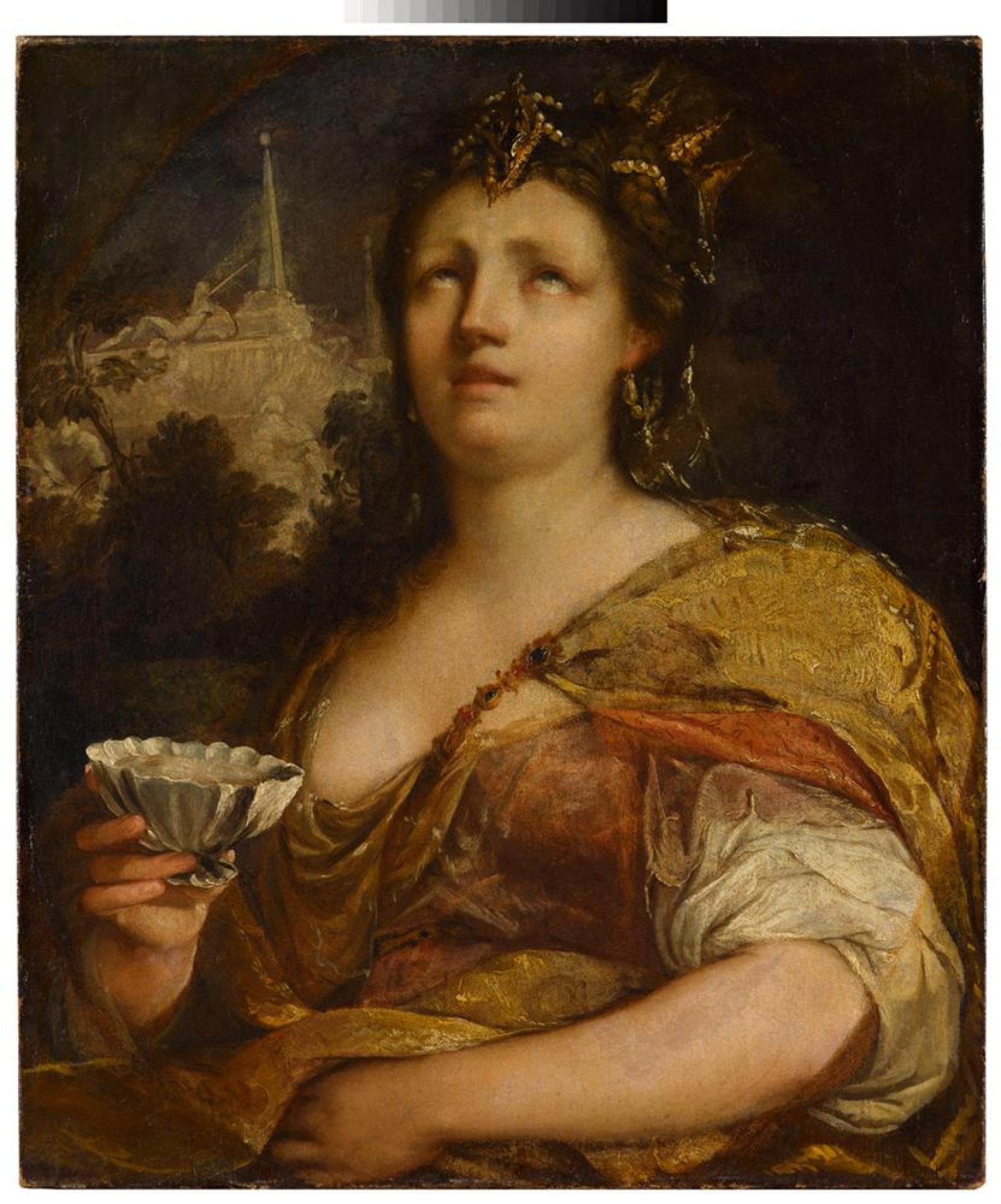 Artemisia war die Königin von Karien, einer antiken Provinz in der heutigen westlichen Türkei. Nach dem Tod ihres Ehemannes Mausolos (353 v.Chr.) übernahm sie die Regentschaft. Überwältigt von Trauer trank sie, wie der antike Autor Plinius d.Ä. (1. Jh. v.Chr.) berichtet, jeden Tag einen Teil seiner Asche. Sein Grabmal, das dem heute verbreiteten Begriff des Mausoleums seinen Namen gab und unter ihrer Führung vollendet wurde, ragt im Hintergrund empor. Als Beispiel für ehrwürdige Hingabe und vielleicht auch als raffinierter Versuch, die weibliche Regentschaft durch die Anwesenheit des toten Königs in Form der konsumierten Asche zu legitimieren, entwickelte sich das Thema der Asche trinkenden Königin zu einem eigenständigen Bildmotiv. Das ehemals ovale Gemälde wurde später zu einem Rechteck erweitert, der alte Bildausschnitt ist noch an den Verfärbungen entlang der Kanten erkennbar. Der rasche und dicke Farbauftrag, der zu einem sichtbaren Pinselstrich und hervortretenden Höhungen führt, wurde zu Beginn des 20. Jhs. dem Barockmaler Bernardo Strozzi (ca. 1581-1644) zugeschrieben, heute wird es mit der Kunst in Florenz oder Venedig in der ersten Hälfte des 17. Jhs. in Verbindung gebracht. Der in den Hauttönen weich verriebene Farbauftrag und das stilisierte aber ausdrucksstarke Gesicht der Königin lassen an das Umfeld von Guido Cagnacci (1609-1663) denken, der als Schüler von Guido Reni (1575-1642) zeitweilig in Bologna gearbeitet hat.