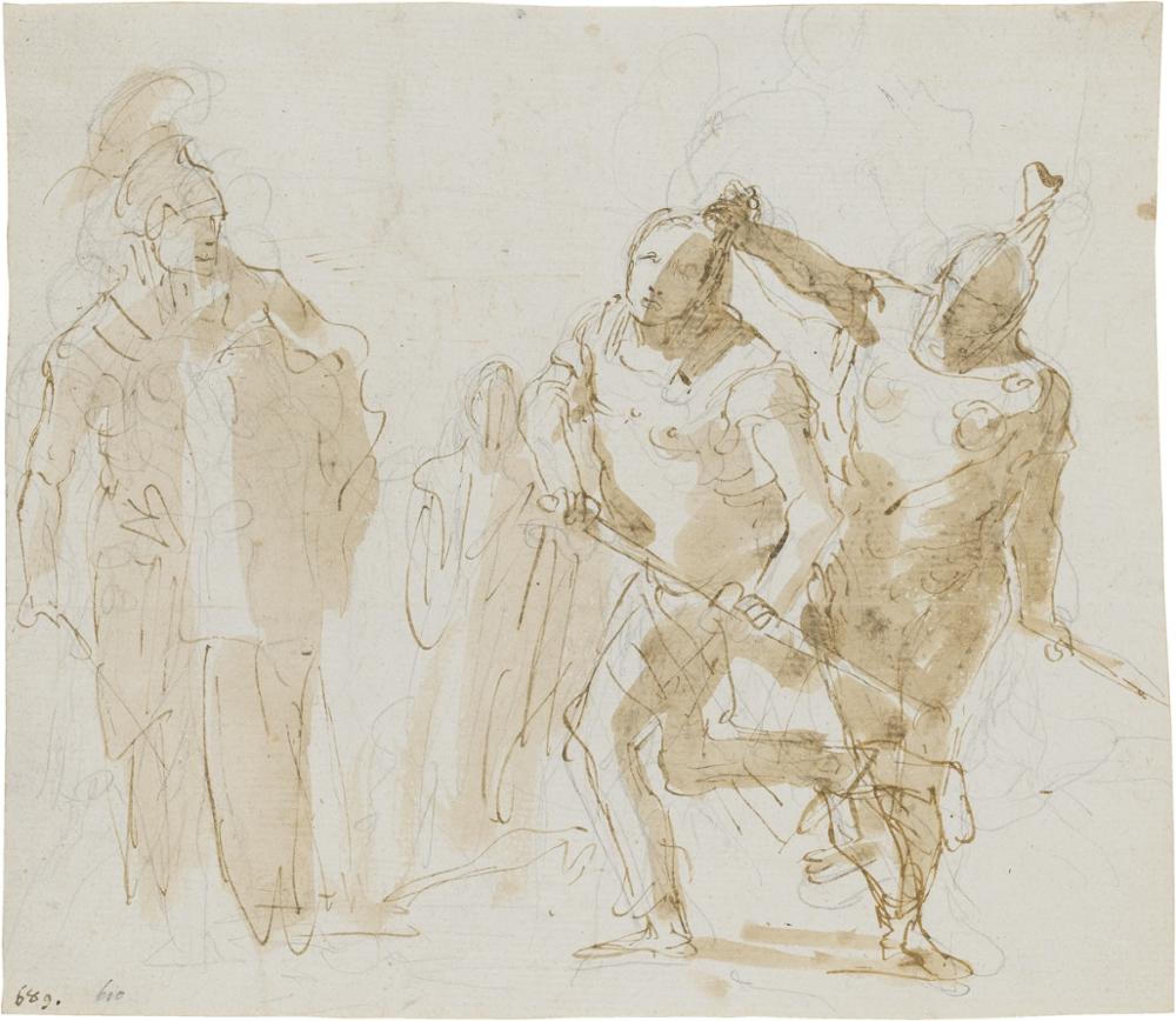 Achill, zornig über König Agamemnon, der ihm die Lieblingssklavin Briseis entführt hat, zieht das Schwert gegen den Heerführer. Die Göttin Athena packt ihn am Haarschopf und hält ihn zurück (Homer: Ilias I, 188–197). Die ungemein freie, sich durch ihr bewegtes Strichbild in brauner Feder über einer leichten Kreidevorzeichnung sowie eine verhaltene Lavierung auszeichnende erste Ideenskizze (primo pensiero) gehört zu einer ganzen Reihe von Studien zu den Fresken in der Villa Valmarana ai Nani bei Vicenza, die Giovanni Battista Tiepolo, zusammen mit seinem Sohn Giovanni Domenico (1727-1804), im Jahre 1757 ausführte (offenbar waren die Fresken vor dem 20.6.1757 vollendet, dem Tag, an dem der Auftraggeber Giustino Valmarana starb). In den verschiedenen Räumlichkeiten waren Szenen aus der »Ilias« von Homer, der »Aeneis« des Vergil, dem »Orlando furioso« von Ariost und Tassos »Gerusalemme liberata« dargestellt, sowie in der Sala dell'Olimpo verschiedene Götter. Unsere Skizze gehört zur Ausstattung der Stanza dell'Iliade (Massimo Gemin und Filippo Pedrocco: Giambattista Tiepolo. I dipinti. Opera completa, Venedig 1993, Nr. 436). Auf und hinter einer mittels illusionistischer Architektur geschaffenen bühnenartigen Fläche agieren die Helden des homerischen Epos. Die endgültige Figurenkonstellation ist in dieser frühen Skizze bereits weitgehend festgelegt, wenn auch die Protagonisten im Fresko weiter auseinanderstehen, hinter ihnen eine Menschenmenge versammelt ist, die in der Zeichnung nur mit einer knapp umrissenen Gestalt angedeutet wird, und einige Details verändert wurden. Agamemnon links wird später bärtig erscheinen, das unklare Standmotiv des Achill in der Blattmitte, verdeutlicht durch die Pentimenti (Korrektur- oder Reuezüge) am rechten Bein, wird in der Ausführung von seinem langen Mantel verdeckt. Mit dieser Skizze steht Giovanni Battista Tiepolo auf dem Zenit seines Könnens: freier und atmosphärischer kann venezianische Zeichenkunst in der Mitte des 18. Jh. nicht sein. Das sensible Abwägen der unterschiedlichen Helldunkelwerte der Lavierung, die von äußerster Transparenz bei der Hintergrundfigur und Agamemnon bis hin zu den pointierten Stellen am Kopf des Achill und dem Arm Athenas führen, ist ebenso beeindruckend wie die spontane Verwendung der Feder, die mit wenigen, zum Teil im Ungewissen endenden Strichen die Figuren dennoch bereits in dieser frühen Werkphase endgültig umreißt. Zwei weitere Zeichnungen in der Stuttgarter Sammlung sind ebenfalls Studien zu den Fresken der Villa Valmarana (Inv. Nr. C 1434, C 1435), desgleichen eine Skizze zu »Athena und Achill« im Berliner Kupferstichkabinett (Inv. Nr. KdZ 11773 verso; Giovanni Battista Tiepolo (1696-1770) und sein Atelier. Zeichnungen und Radierungen im Berliner Kupferstichkabinett, bearbeitet von Hein-Thomas Schulze Altcappenberg, Ausst.-Kat. Staatliche Museen zu Berlin, Kupferstichkabinett [30.11.1996-2.3.1997], Berlin 1996, bei Nr. 8; zu weiteren Zeichnungen zur Villa Valmarana vgl. Stuttgart 1996, Nr. 24).