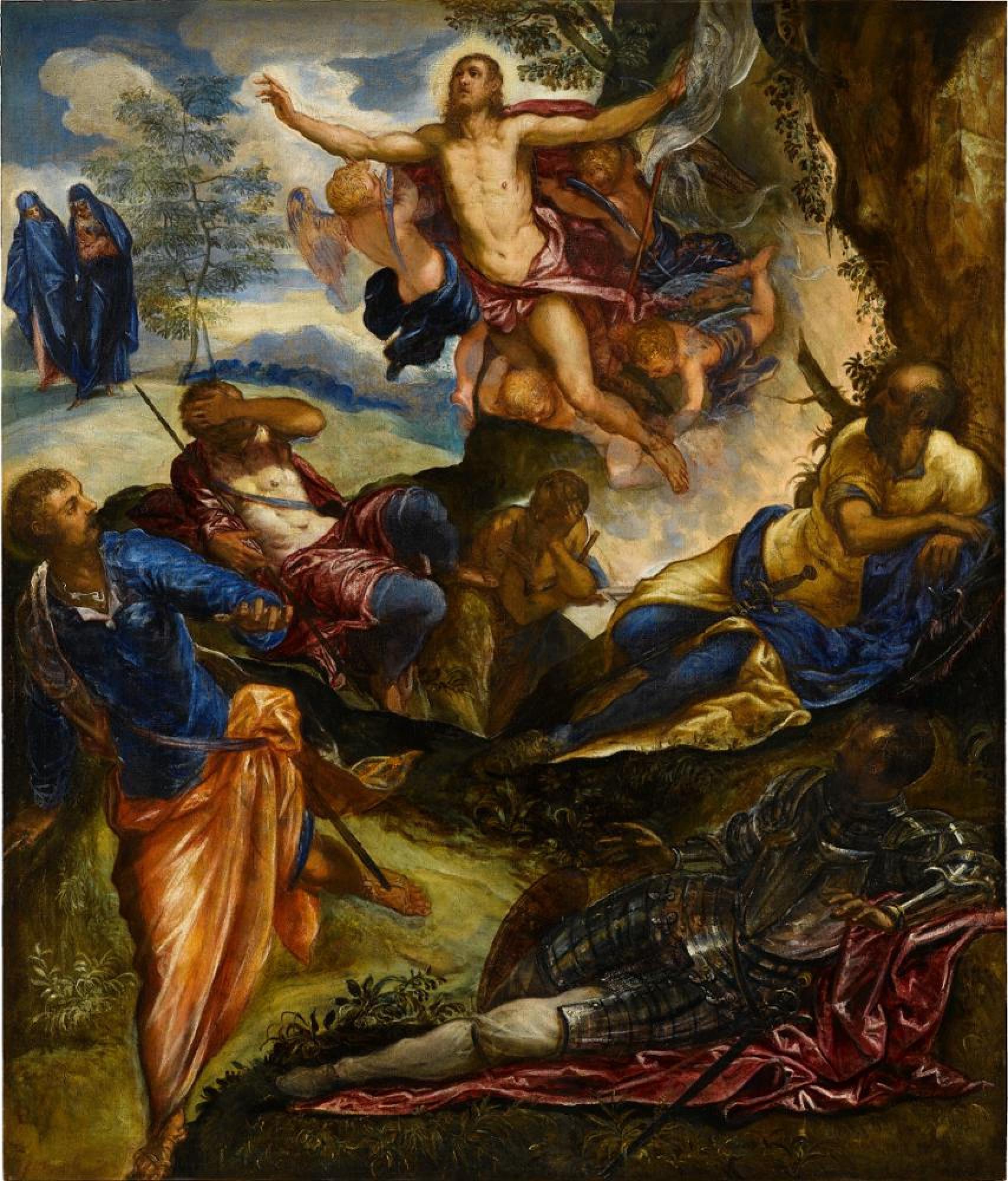 Der Sohn eines Seidenfärbers (tintore) war der bedeutendste Vertreter des Manierismus in Venedig. Expressivität und eine dynamische Formgebung bestimmen seine Kompositionen, für die komplizierte Körperdrehungen überlängter Figuren, kunstvolle Beleuchtungseffekte und kühne Perspektiven charakteristisch sind. Mit weit geöffneten Armen entschwebt Christus der Felsenkammer. Vom jäh aus der Höhle brechenden, überirdischen Schein des Osterwunders geblendet, erstarren die Wächter vor Furcht oder versuchen zu fliehen. Die überwiegend kühle Farbigkeit wird durch zuckende Lichtreflexe belebt.