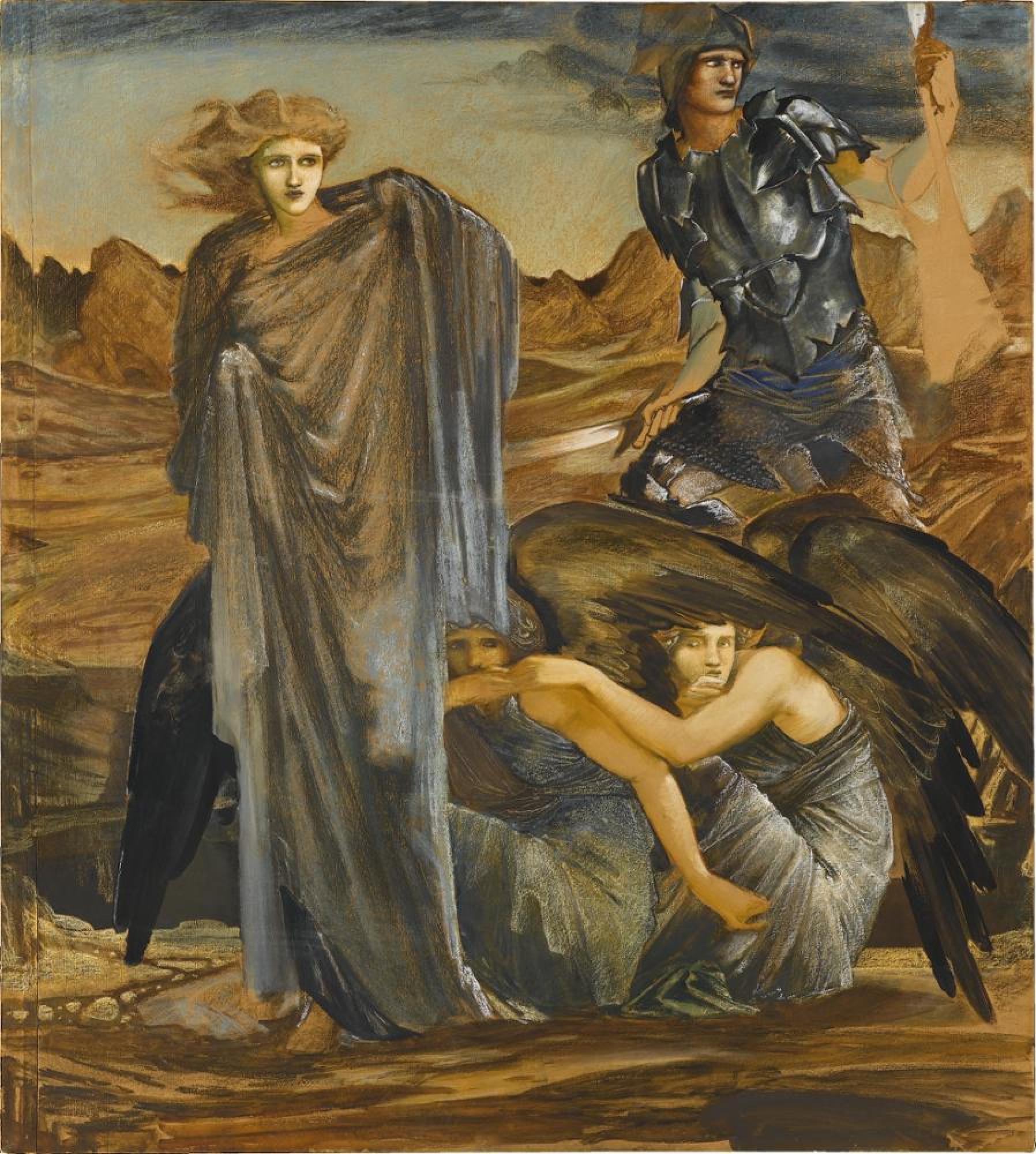 Burne-Jones interpretiert Medusa als typisch viktorianisches »gefallenes Mädchen« in antikem Gewand. Als verführerische Unschuld vom Meeresgott Poseidon mit falschen Versprechungen gelockt und im Tempel der Athena geschwängert, wird sie von der zornigen Göttin verflucht. Athena verbannt sie ans Ende der Welt, versieht sie mit Schlangenhaaren und dem Blick, der jedes Wesen versteinern lässt. Ihre hoch aufragende Gestalt dominiert das Bild. Ihre geflügelten Geschwister klammern sich zu ihren Füßen aneinander. Von diesem Teil des Zyklus vollendet Burne-Jones nur den Karton, der das geplante Ölgemälde vorbereitet. Die tragische Pose, Medusas Zerren an ihrem Gewand und das Trocknen ihrer Tränen übernimmt der Maler aus dem Text von Morris. Perseus betrachtet die Unglückselige im Spiegel. Bei Morris fordert die Gorgone den für sie unsichtbaren Helden dazu auf, Gnade walten zu lassen und ihrem Leid ein Ende zu machen. Edward Burne-Jones (1833–1898) gilt als der bedeutendste Vertreter der zweiten Generation der Präraffaeliten, der einflussreichsten Kunstströmung des Viktorianischen Zeitalters. 1875 erhält er den Auftrag, das Empfangszimmer im Londoner Anwesen des späteren britischen Premierministers Arthur James Balfour (1848–1930) mit einem Wandzyklus auszustatten. Bei der Umsetzung ist er an keine inhaltliche Vorgabe gebunden und wählt als Thema den antiken Perseus-Mythos. Seine literarische Vorlage ist das epische Gedicht »The Earthly Paradise« (»Das irdische Paradies«) von William Morris (1834–1896). Morris ist Textildesigner, Dichter, Romancier, Übersetzer und sozialistischer Aktivist. Als Freund und Geschäftspartner inspiriert er Burne-Jones zu zahlreichen seiner wichtigsten Arbeiten. Das achte Kapitel von »The Earthly Paradise« handelt von den Abenteuern des Halbgottes Perseus, des Sohnes. von Danae und Zeus. Teile des achtteiligen Zyklus bleiben unvollendet. 1971 gelangt er aus New Yorker Privatbesitz in die Staatsgalerie.