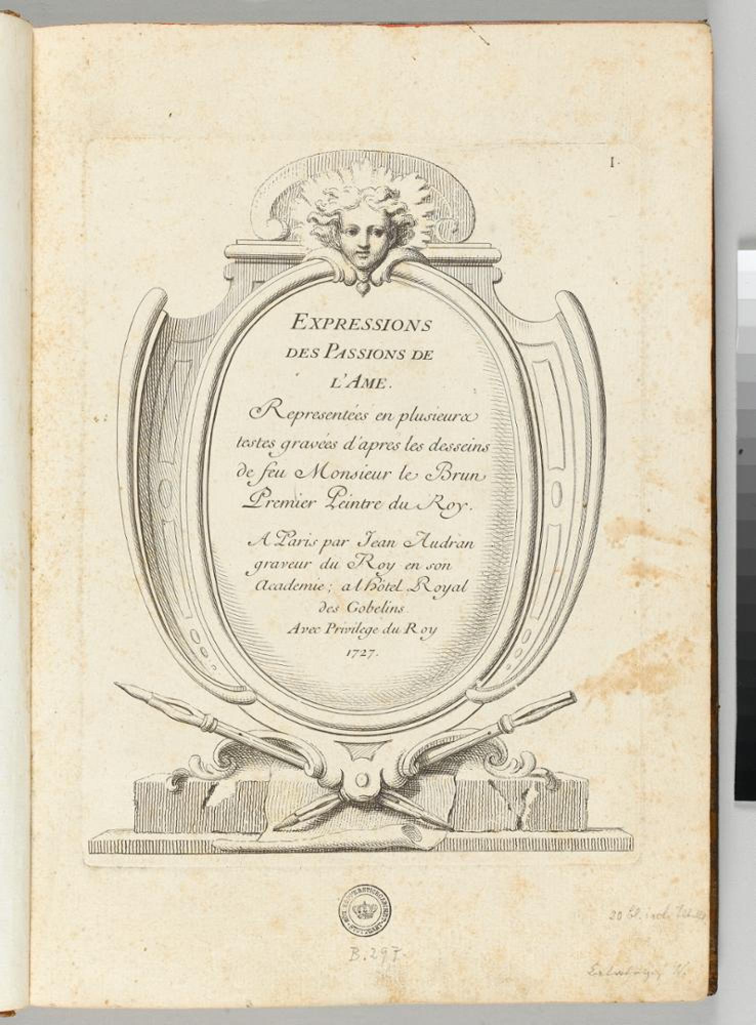 »Expressions des passions de lʼame« ist der Titel einer Kupferstichpublikation von 19 Affektstudien. Das Titelblatt nennt die Beteiligten: »Dargestellt in mehreren Köpfen in Kupferstich nach den Zeichnungen des verstorbenen Herrn le Brun, erstem Maler des Königs. In Paris durch Jean Audran, Königlicher Kupferstecher, in seiner Akademie im Haus der Königlichen Gobelinmanufaktur. Mit Königlichem Privileg 1727.« Eingerahmt wird der Text von einer mit Voluten geschmückten Kartusche, an deren Sockel sich zwei Zeichengriffel kreuzen; oben bekrönt vom strahlenumkränzten Gesicht des Sonnengotts. Lebrun, auch Direktor der Königlichen Kunstakademie, verbindet mit seiner Ausdruckslehre moralphilosophisch und medizinisch inspirierte Theorien. Allein schon an Köpfen, aus dem bilderzählerischen Zusammenhang isoliert, lassen sich die menschlichen Emotionen durch Physiognomie und Mimik darstellen. Dieses Lehrbuch dient so dem Studium der Affekte wie dem Erlernen des Zeichnens.
