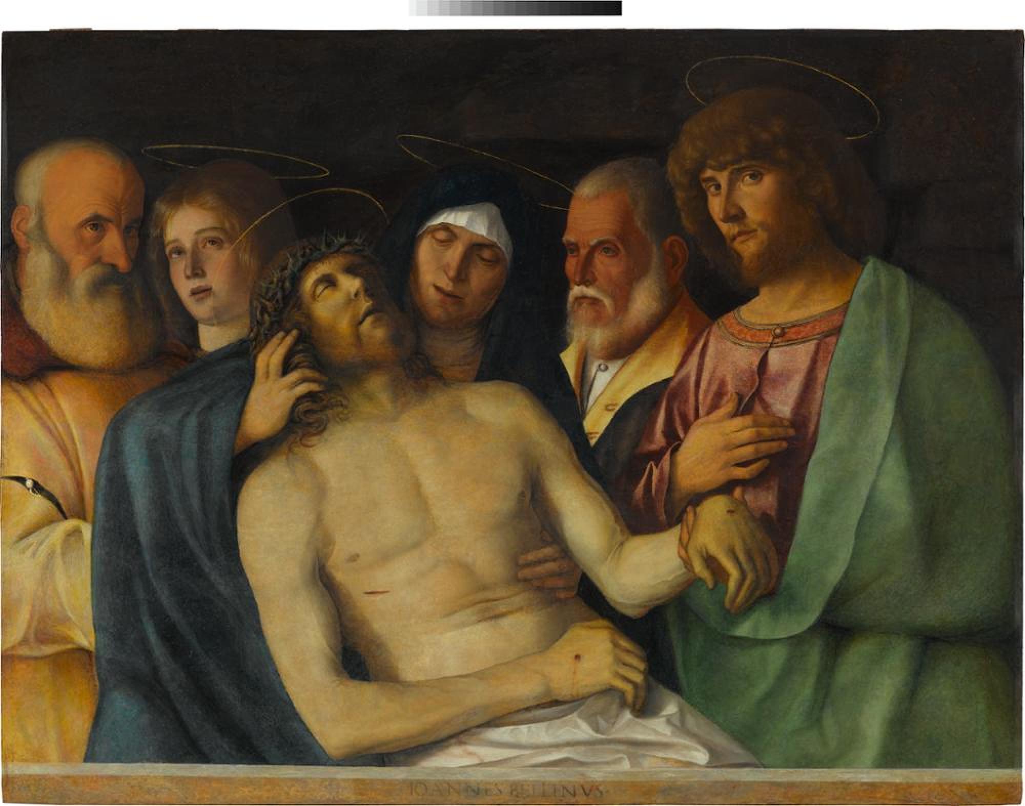 Der klare Bildaufbau und ein harmonisches Farbenspiel zeichnen die Gemälde des Venezianers Bellini aus, der maßgeblich an der Entwicklung des privaten Andachtsbildes beteiligt war. Vor allem seine Kompositionen mit nebeneinander aufgebauten Halbfiguren revolutionierten die Malerei. Der Leichnam Christi, gestützt von Maria, wird umgeben von Joseph von Arimathia und Nikodemus, die ihn vom Kreuz genommen haben, sowie Magdalena. Johannes, der Lieblingsjünger, ergreift seine leblose Hand und fordert den Betrachter mit eindringlichem Blick zur Kontemplation auf. Er ist auch der Namensheilige des Künstlers; daher wird in ihm ein Selbstbildnis Bellinis vermutet.