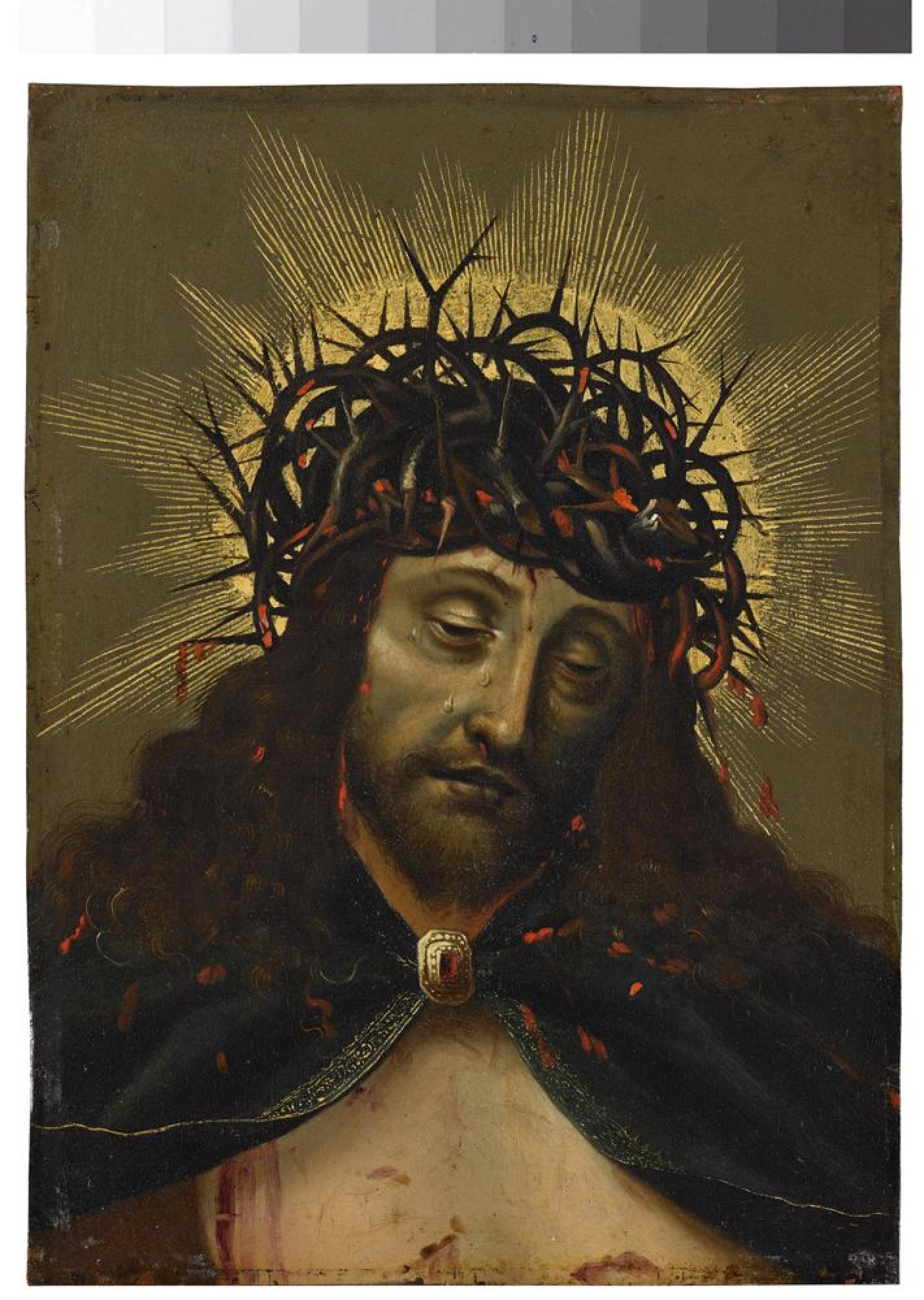 Gemäß der biblischen Überlieferung wird Christus vor der Kreuzigung von den Schergen des römischen Stadthalters von Jerusalem, Herodes, ausgepeitscht und gedemütigt. Dazu gehört die Krönung mit Dornen - ein Marterwerkzeug der Passion und eine weit verehrte Reliquie im Christentum. Der Bildausschnitt zeigt den blutüberströmten Jesus mit Dornenkrone und Mantel; Blau wird hier als traditionell königliche Farbe verwendet. So wurde er laut Bibel dem Volk vor der Kreuzigung vorgeführt. Anstelle der Episode aus der Passion konzentriert sich der Bildausschnitt auf den Gottessohn als isoliertes Andachtsmotiv: Sein Leidensweg und die dadurch versprochene Erlösung werden zum Ziel der Betrachtung. Das auf Kupfer gemalte Bild gilt seit seiner Ankunft in der Staatsgalerie als Werk des spanischen Renaissance-Malers Vincente de Masip, auch als Juan de Juanes (1507-1579) bekannt. Das Motiv geht auf eine Komposition von Quentin Massys (ca. 1466-1530) zurück, die auf der Iberischen Halbinsel verbreitet war und dort im späten 16. und 17. Jh. als Andachtsbild eine gewisse Nachfolge fand. Andachtsbilder aus der Massys-Werkstatt befinden sich heute etwa in Venedig und Coimbra und waren womöglich frühe Exportstücke. Eine ähnliche Fassung auf Kupfer, mit engerem Bildausschnitt und und weicher verriebenem Farbauftrag, der mit oberitalienischer Tendenz verbunden wird, befindet sich Oldenburg (Landesmuseum für Kunst und Kulturgeschichte).