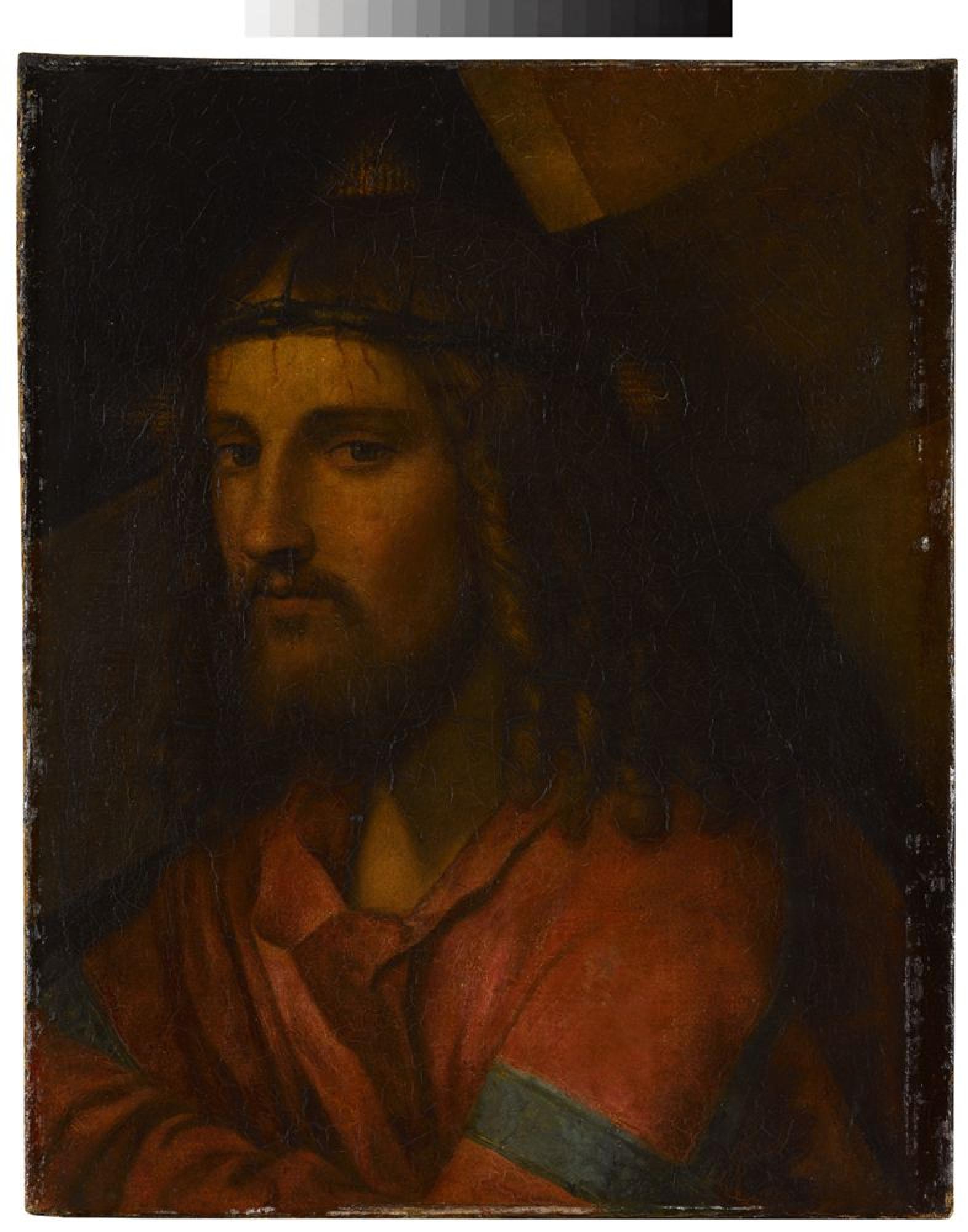 Christus, der direkt auf uns als Betrachtende blickt, wird aus dem erzählerischen Kontext der Kreuztragung gelöst und im ausschnitthaften Brustbild gezeigt. Das Motiv entwickelte sich in Venedig im ausgehenden 15. Jh. zu einem beliebten Thema für private Andachtsbilder. Das ebenmäßige Gesicht und der direkte Blick kombinieren das Antlitz Jesu, das durch Berührungsreliquien verehrt wurde, mit einer menschlichen Nähe, die zur religiösen Einfühlung in sein Leiden anregen sollte. Bei der Erwerbung des Bildes mit der Sammlung Barbini-Breganze 1852 wurde es dem in Venedig tätigen Maler Paris Bordone (1500-1571) zugeschrieben (eine Variante nach Bordone befindet sich ebenfalls in der Staatsgalerie, Inv. Nr. 128). Zuletzt wurde es von Fritz Heinemann als eine von mehreren Kopien nach einem Werk eingestuft, das sich im 19. Jh. im Palazzo Loschi in Venedig befand und aufgrund seiner porträthaft gestalteten Züge und des verriebenen Farbauftrags lange Zeit als Werk Giorgiones (1477/8-1510) galt (heute Boston, Isabella Stewart Gardner Museum). In neuer Zeit wurden die Venezianer Giovanni Bellini (ca. 1430-1516) und Vincenzo Catena (ca. 1480-1531) als Schöpfer diskutiert, deren malerischem Vorbild die Stuttgarter Fassung verpflichtet bleibt.