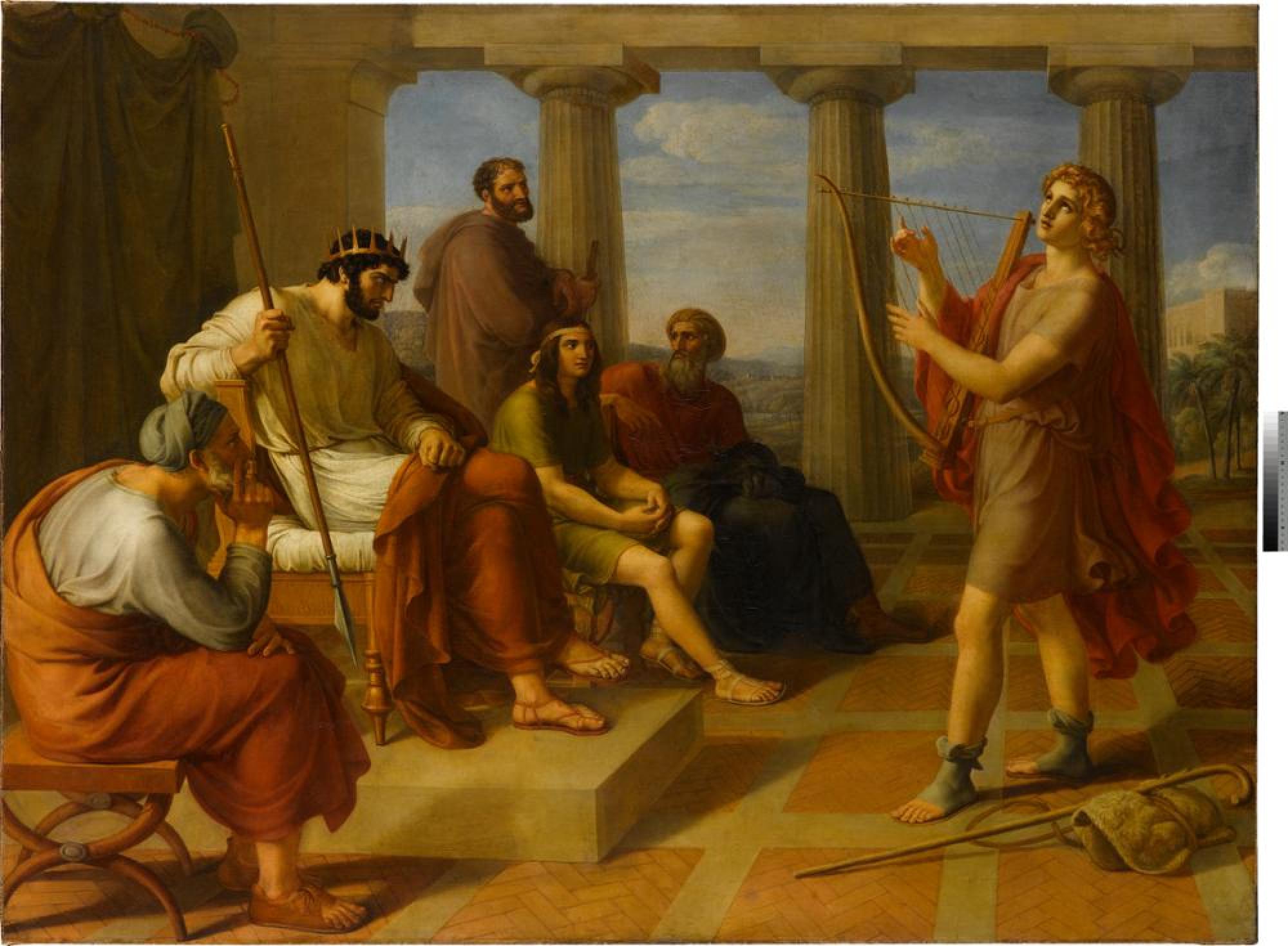 Kurfürst Friedrich von Württemberg, der spätere König Friedrich I., erhielt das Bild aus Rom als Dank für ein Reisegeld übersandt. Sein Nachfolger, Wilhelm I., schenkte es dem Museum zur Eröffnung 1843. Bewusst hatte Schick ein biblisches Thema für sein erstes monumentales Historiengemälde gewählt. König Saul, von bösen Mächten besessen, wird besänftigt durch das Spiel des einfachen Hirten. Das Thema enthielt die versteckte Bitte an den Landesfürsten, sich der moralischen Erbauung durch die Künste gnädig zu zeigen. Schick hatte seine Lektion in Rom gelernt, denn offenkundig fand das Studium Michelangelos und Raffaels Eingang in sein klassizistisches Werk. [CC]