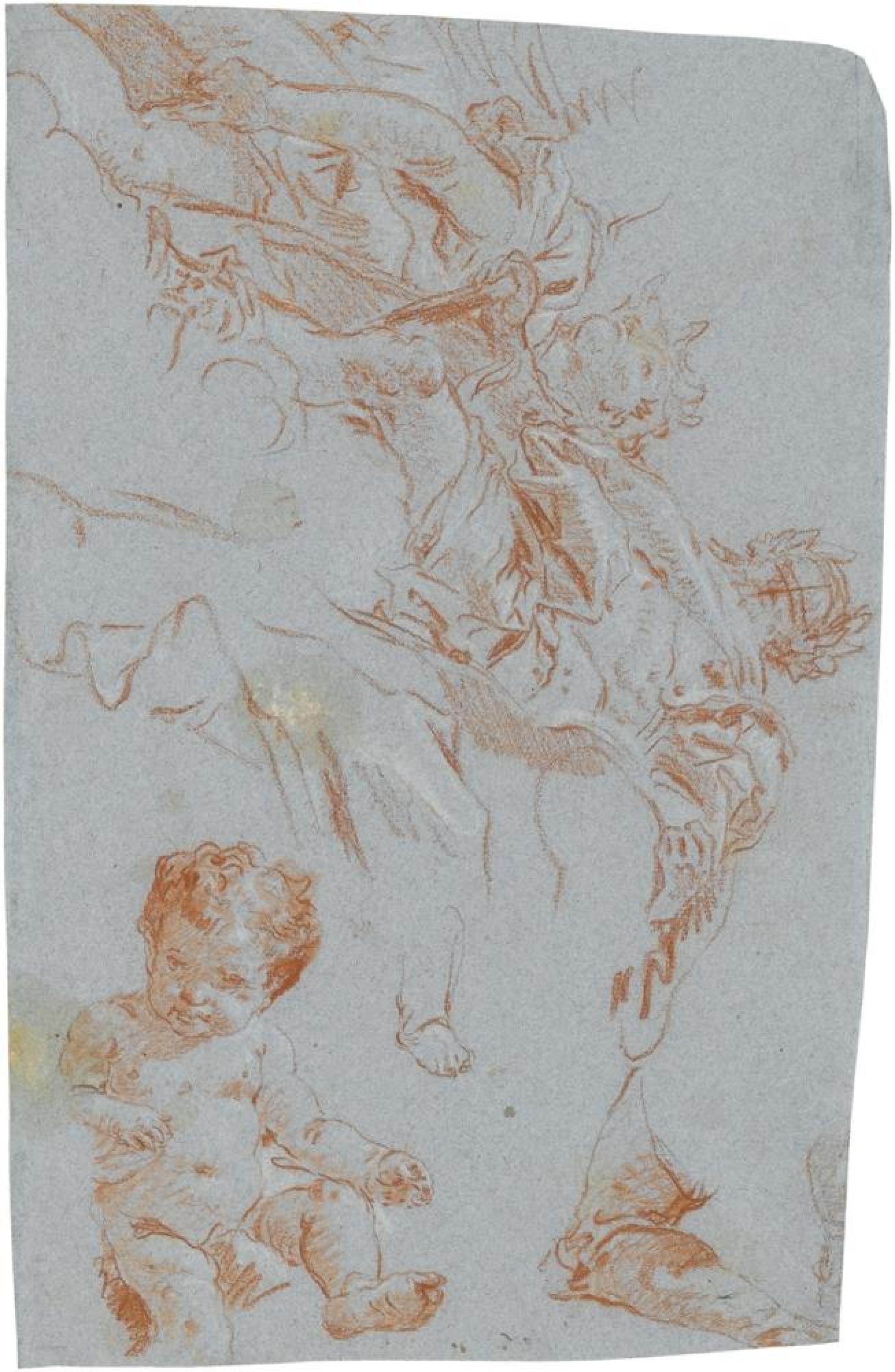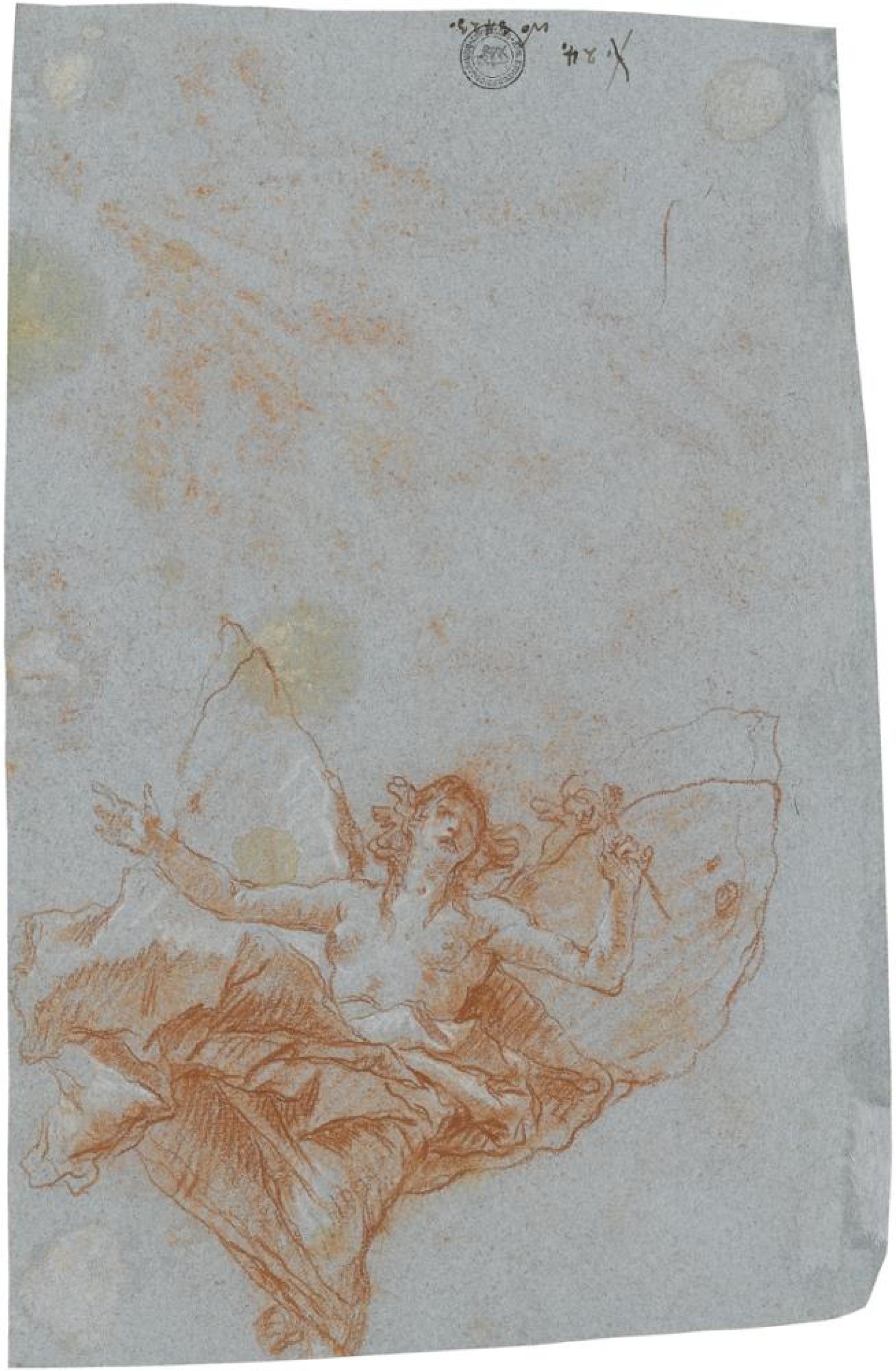 Auf der Vorderseite dieser Zeichnung sind Skizzen zu und nach verschiedenen Projekten der Familie Tiepolo vereint. Die auf Wolken thronende, lorbeerbekränzte männliche Figur, begleitet von einem Engel, ist eine Vorstudie Giovanni Battistas zur zentralen Gestalt im Deckengemälde mit der »Apotheose des Angelo della Vecchia umgeben von Tugenden«, das sich ehemals im Palazzo Della Vecchia in Vicenza befand und heute im Palazzo Isimbardi in Mailand aufbewahrt wird (Massimo Gemin und Filippo Pedrocco: Giambattista Tiepolo. I dipinti. Opera completa, Venedig 1993, Nr. 406). Da der Palast zwischen 1748 und 1750 errichtet wurde, schuf Tiepolo das Gemälde wohl im Laufe des Jahres 1750, auf jeden Fall noch vor seiner Abreise nach Würzburg, wo er am 12.12. eintraf. Bemerkenswert in der Zeichnung ist die extreme Skizzenhaftigkeit, mit der die beiden Figuren erfasst sind, sowie die auffallende Geometrisierung des Gesichts, die für einen Entwurf spricht. Drei weitere Blätter in Stuttgart gehören ebenfalls zu diesem Projekt (Inv. Nr. C 1459, C 1487, C 1475/C 1492). Die rechte untere Ecke des Blattes blieb zunächst frei, die Zeichnung lag im Gepäck, das Vater und Söhne mit nach Würzburg nahmen. Erst hier holte Giovanni Domenico die Studie wieder hervor und nutzte die leere Stelle, um den Ricordo (Nachzeichnung zur Erinnerung) nach einem Werk Giovanni Battistas festzuhalten: Er zeichnete das Christuskind aus dem Gemälde »Anbetung der Könige«, das der Vater 1753 für die Benediktinerabtei Münsterschwarzach schuf und das sich heute in der Alten Pinakothek zu München befindet (ebd., Nr. 418). Die kleine Skizze nach dem linken Fuß des Christuskindes sowie die Armstudie rechts oben stammen ebenfalls von Giovanni Domenico. Auf der Rückseite der Zeichnung schließlich kopierte er die Figur der »Flora« aus dem Deckenfresko im Treppenhaus der Würzburger Residenz (ebd., Nr. 415; James Byam Shaw: Tiepolo Celebrations: Three Catalogues, in: Master Drawings 9, 1971, S. 272 sieht das Verso als Kopie an, vermutet aber eher Lorenzo als Zeichner; vgl. ausführlich Stuttgart 1996, Nr. 10).