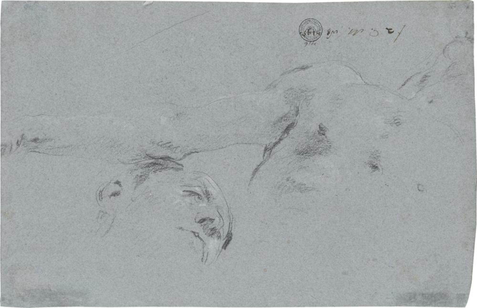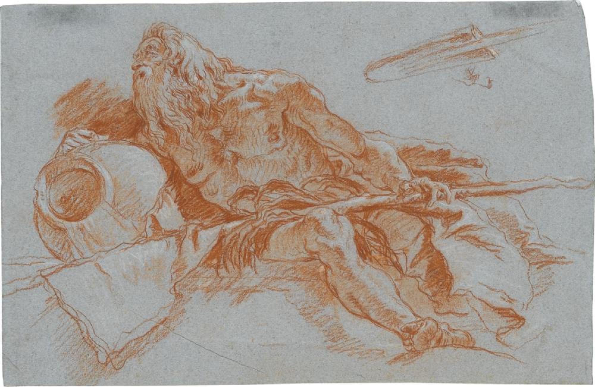 Der Flussgott Nil erscheint im Würzburger Treppenhausfresko rechts neben der »Afrika« (Inv. Nr. C 1477 verso) und dem vor ihr »Knienden Mann mit Sonnenschirm« (Inv. Nr. C 1470) (Massimo Gemin und Filippo Pedrocco: Giambattista Tiepolo. I dipinti. Opera completa, Venedig 1993, Nr. 415; Der Himmel auf Erden. Tiepolo in Würzburg, hg. von Peter O. Krückmann, Ausst.-Kat. Würzburg, Residenz [15.2.-19.5.1996], München und New York 1996, Bd. 1, Abb. S. 109). Da das Papier zu klein für die gesamte Darstellung war, hat Giovanni Domenico Tiepolo den unteren Teil des Ruders in seiner Nachzeichnung rechts oben ergänzt. Allein diese Trennung spricht bereits für einen Ricordo (Nachzeichnung zur Erinnerung), wobei nicht unerwähnt bleiben soll, dass auch das Tagewerk des Freskos genau an dieser Stelle abgrenzt, der untere Teil des Ruders demnach separat gemalt wurde. Besonders auffällig ist jedoch, dass der Zeichner sehr exakt an einigen Stellen die Pinselschraffuren des nackten Oberkörpers im Fresko auf dem Papier wiederholt, so beispielsweise in den Partien um die Brustwarzen und unterhalb des rechten Armes. Kein Maler würde umgekehrt die Schraffuren seiner Vorstudie ins Gemälde derart genau übernehmen. Vergleicht man den »Nil« mit Giovanni Battistas Nachzeichnung nach dem »Knienden Mann mit Sonnenschirm« (Inv. Nr. C 1470), so wird der unterschiedliche Zeichenstil von Vater und Sohn deutlich: Benutzt Giovanni Battista großzügige Linien, so verwendet Giovanni Domenico das seinen Blättern stets eigene kleinteiligere Strichbild. Auch die Konturen sind bei ihm meist mehrfach gezogen, während der Vater mit einer, höchstens zwei Linien auskommt. Ebenso sind die kleinen kurzen Rötelstriche, besonders zur Charakterisierung der Muskeln des Oberkörpers, typisch für den Sohn. Dass die Ricordi direkt auf dem Gerüst entstanden sind, zeigt nicht nur die genaue Übernahme der Pinselschraffuren, sondern auch ein kleines Detail am linken Rand der Wasserurne. Hier könnte der Topf etwas angeschlagen sein, wahrscheinlicher ist jedoch, dass beim Arbeiten an dem dunklen Stein daneben diese Stelle flüchtig übermalt wurde. Der Betrachter sieht dies von unten, auf den Treppenstufen stehend, nicht, wohl aber der Künstler auf dem Gerüst, der demgemäß eine kleine Einbuchtung am Rand zeichnet. Auch diese Beobachtung spricht für die Nachzeichnung. Die Studien in schwarzer und weißer Kreide auf der Rückseite des Blattes hingegen zeigen den souveränen Zeichenstil Giovanni Battista Tiepolos. Sie gehören vielleicht als erste Ideenskizzen zu dem in der Würzburger Zeit 1752/53 entstandenen Gemälde »Rinaldo verlässt Armida« (Gemin/Pedrocco 1993, Nr. Abb. 420).