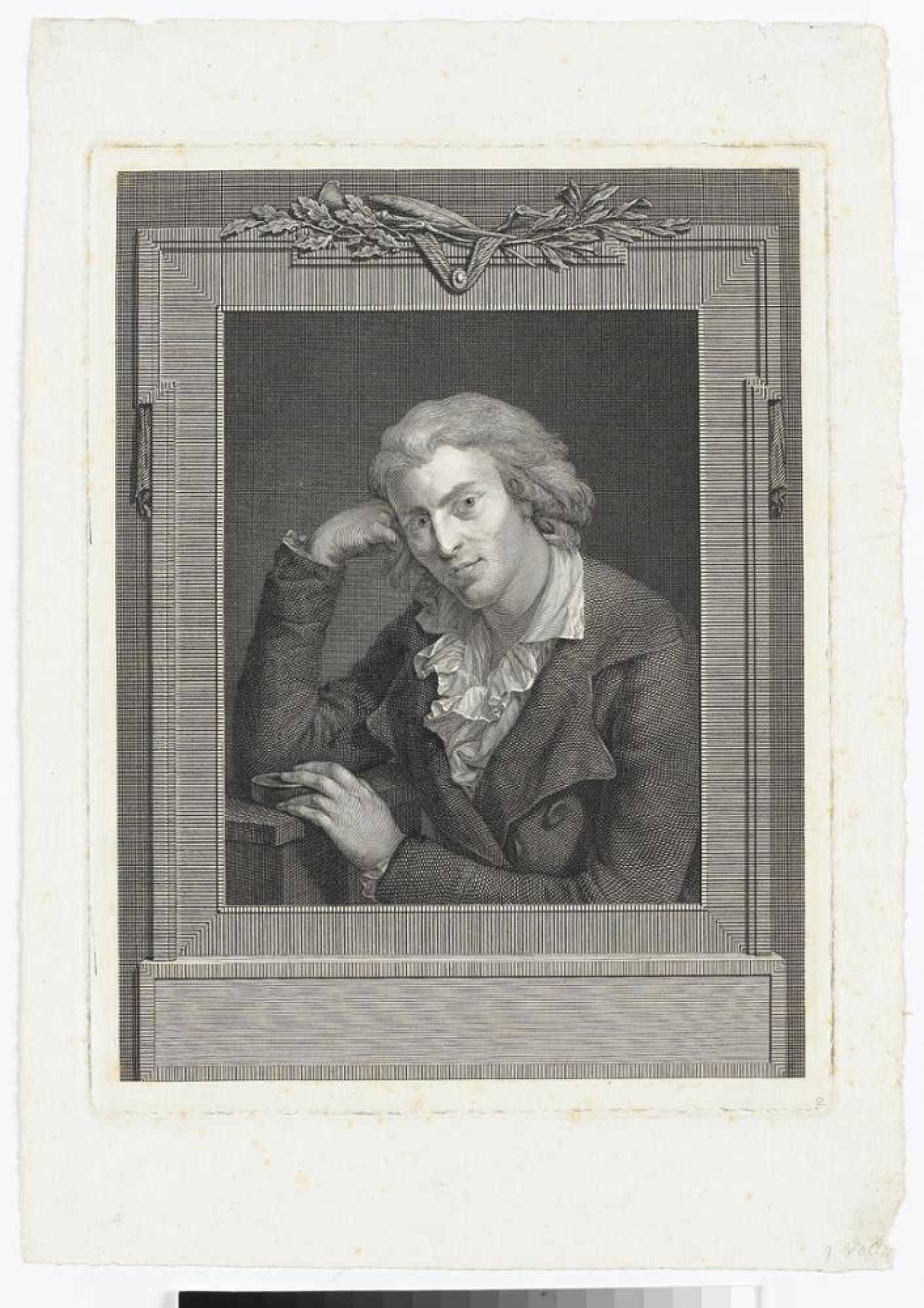 Am Ende des 18. Jahrhunderts änderte sich die Porträtauffassung für die Personengruppe der Gelehrten und Staatsmänner, betrieben doch Staatsmänner mitunter eigene literarische Beschäftigungen, die zu ihrer Zeit durchaus anerkennend wahrgenommen wurden. Im 18. Jahrhundert begann jedoch die Tendenz, das ornamentale und allegorische Beiwerk in Porträts bedeutender Persönlichkeiten wieder zurückzunehmen zugunsten einer wirklichkeitsnahen Darstellung im Kontext der Tätigkeit. Konzentrierter Blick, leichte Wendung des Kopfes, ein nachdenklicher Moment bei der intellektuellen Arbeit: solche Merkmale der Charakterisierung einer Persönlichkeit blieben bestimmend gerade für Gelehrtenporträts. Der europaweit renommierte Kupferstecher Johann Gotthard Müller verwendete sie im Porträt des Dichters Friedrich Schiller, nach einer Vorlage von Anton Graff. Das Bild erschien im Verlag J.F. Frauenholz zu Nürnberg, für die Johann Gotthard Müller auch weitere Porträtstiche lieferte. Porträts sind bei Johann Gotthard Müller die größte Einzelgattung. Diese nimmt nach der Akademieausbildung und der Rückkehr nach Stuttgart eine herausragende Stellung innerhalb des Werks ein. Aufgrund inhaltlicher und formaler Aspekte lassen sich die Porträts in drei Gruppen unterteilen, nämlich die Künstlerporträts, die Bildnisse von Gelehrten und Staatsmännern sowie diejenigen von Herrschern und Prinzen. Generell unterlagen die Porträts einigen technischen und theoretischen Prämissen, die die Stecher zu berücksichtigen hatten. Als typische nahsichtige Arbeiten, mussten Bildnisse detailliert sein, durften aber keine übertriebene Genauigkeit aufweisen. Das Inkarnat sollte dem jeweiligen Alter entsprechen, für Männer durchaus einen kräftigen Eindruck hinterlassen, bei Frauen dagegen eine weiche und zarte Erscheinung erzeugen. Dabei waren Kreuzschraffuren in den Hauptpartien zu vermeiden, um eine zu glatte Oberfläche zu verhindern. Ziel war eine lebendige und ähnliche Darstellung, wobei sich die Ähnlichkeit nicht auf diejenige zwischen Dargestelltem und Stich reduzierte, sondern sich auch auf die Beziehung zwischen Gemälde und Zeichnung und Stich bezog, wenn die Druckgraphik nicht nach eigenen Studien nach der Natur entstand. Das Schillerporträt weist viele Merkmale auf, die auch für Künstlerporträts charakteristisch sind. Schiller gilt als der bedeutendste deutsche Dramatiker. Viele seiner Theaterstücke gehören zum Standardrepertoire der deutschsprachigen Theater. Auch als Lyriker war er erfolgreich: Seine Gedankenlyrik wurde exemplarisch, seine Balladen zählen zu den beliebtesten deutschen Gedichten. Schiller gehört mit Wieland , Goethe und Herder zum Dichter- und Gelehrtenkreise der Weimarer Klassik. Nur im Schillerporträt findet sich in der Gegenüberstellung von Rock und weißem Hemd und in der Differenzierung des Rocks eine ähnliche Wirkung. Dabei zeigt sich in diesem Bildnis Müllers generelle Tendenz in der Behandlung verschiedener Stofflichkeiten. Müller arbeitet auch in den für seine Verhältnisse weniger präzise gestochenen Blättern technisch sorgfältig und detailliert, auch wenn die Akribie der Texturen und des Inkarnats hinter den Künstlerporträts zurückbleibt. Gerade im Porträt von Schiller wird manifestiert, dass es sich bei den anderen Porträts nicht um Künstler handelt. Obwohl Müller nach einem kaum vollendeten Gemälde stach, entsteht eine Spannung zwischen dem einfachen und dem differenziert ausgearbeiteten Bildfeld. Die einzelnen Texturen sind fein voneinander abgesetzt, auch wenn die Stoffwirkungen im Vergleich zu den Künstlerporträts weniger effektvoll sind. Diese Ausarbeitung ist mit dem jeweiligen Gemälde verbunden, denn es war von den Stechern gefordert, das Original möglichst adäquat umzusetzen, so dass nur angelegte oder angedeutete Effekte auch nur zurückhaltend umgesetzt wurden. Neben dieser adäquaten Umsetzung des Gemäldes wurde von gemalten wie von druckgraphischen Porträts aber gefordert, dass die Wiedergabe nicht nur äußerlich der dargestellten Person ähnlich sein, sondern auch deren Charakter zeigen sollte. Diese Kategorie der zweifachen Resemblance wurde bei Müller in allen Porträts als erfüllt gesehen. Weniger die äußerliche effektvolle Durcharbeitung als die gefühlvolle Auseinandersetzung und Umsetzung der Erscheinung sowie der charakterlichen Wirkung galten in der deutschsprachigen Kunstkritik als entscheidende Kategorien. Das andere Merkmal betrifft die Umrahmung (oben Feder und Posaune, Lorbeer- und Eichlaubzweig). Auch wenn Müller galerieartige Einfassungen verwendete, wie in dem Bildnis von Schiller, blieb ein scheinarchitektonischer Eindruck bestehen, der aus der hinterfangenden Wand resultiert. Insgesamt zeigt sich also in den Porträts von Johann Gotthard Müller eine Ambivalenz in der Präsentation durch Rahmenformen und deren Verständnis sowie in der stofflichen Differenzierung. Während die Künstlerbildnisse von Beginn an die Effekte berücksichtigen, sind die frühen Gelehrtenbildnisse eher zurückhaltend, und erst um die Jahrhundertwende zeigen sich auch in den anderen Bildnissen Effekte, die denjenigen der Künstlerporträts vergleichbar sind. [CM]