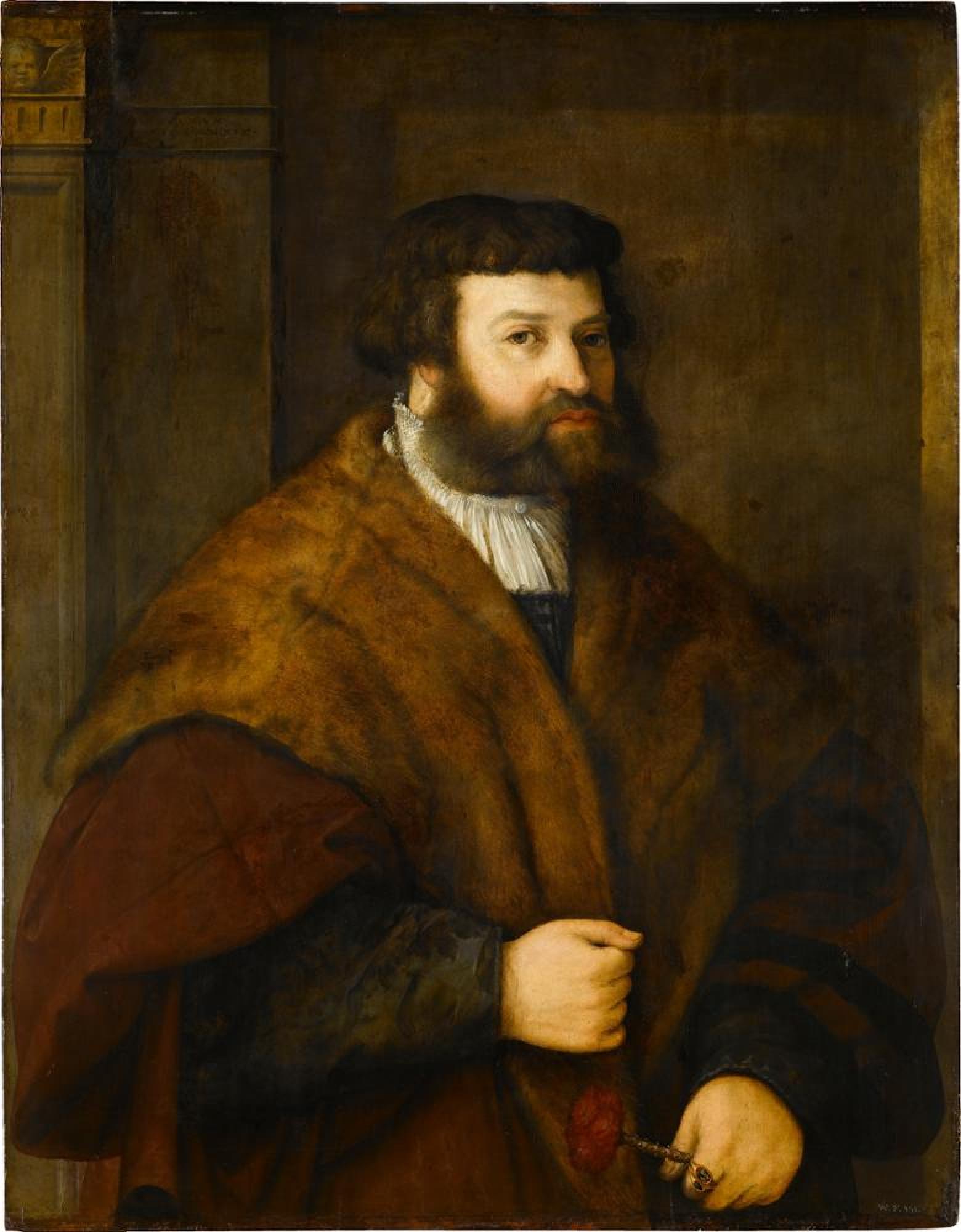 Bei dem laut Inschrift 39-jährigen Dargestellten handelt es sich um Georg Hörmann (1491-1552) aus Kaufbeuren. Als erfolgreicher Kaufmann im Dienst der Fugger tätig, erhielt er auf dem Augsburger Reichstag von 1530 die Bestätigung seiner Erhebung in den erblichen Reichsadelsstand durch Kaiser Karl V. Es ist anzunehmen, dass diese Ehrung den Anlass für den Porträtauftrag gab, wofür auch der sich im Bildnis äußernde repräsentative Anspruch Hörmanns spricht. Die strenge Modelltreue bei gleichzeitiger Idealisierung des Dargestellten und die differenzierte Stoffmalerei sind charakteristische Merkmale der Bildniskunst Ambergers. [EW]
