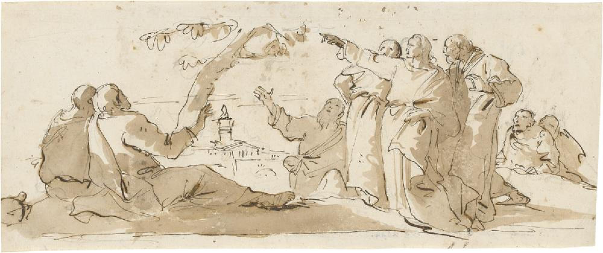 Das Gleichnis vom verdorrten Feigenbaum findet sich bei Markus (11, 12-14, 20-25): Jesus, den hungert, verflucht einen Feigenbaum, der nur Blätter, aber keine Früchte trägt, »denn es war noch nicht Zeit, dass Feigen sein sollten«. Uns so sprach er: »Von dir wird niemand mehr essen in Ewigkeit.« Als er am nächsten Morgen mit seinen Jüngern wieder an dem Baum vorbeikam, bemerkte Petrus: »Rabbi, siehe, der Feigenbaum, den du verflucht hast, ist verdorrt.« Jesus antwortete: »Habt Glauben an Gott... Alles, was ihr bittet in eurem Gebet, glaubet nur, dass ihr' s empfangen werdet, so wird' s euch werden.« Das etwas seltsam anmutende Gleichnis steht für den Glauben an Gott: Im Vertrauen an ihn geschieht auch sein Wille. Obgleich die Komposition in Verbindung mit einem gleichnamigen Gemälde des Sohnes Giovanni Domenico (1727-1804) in Privatbesitz steht, handelt es sich jedoch mit der charakteristischen Verwendung weniger Umrisslinien und der großzügigen Lavierung um ein Blatt von Giovanni Battista. Daher kann vermutet werden, dass der Vater dem Sohn diese Zeichnung als Vorlage geliefert hat.