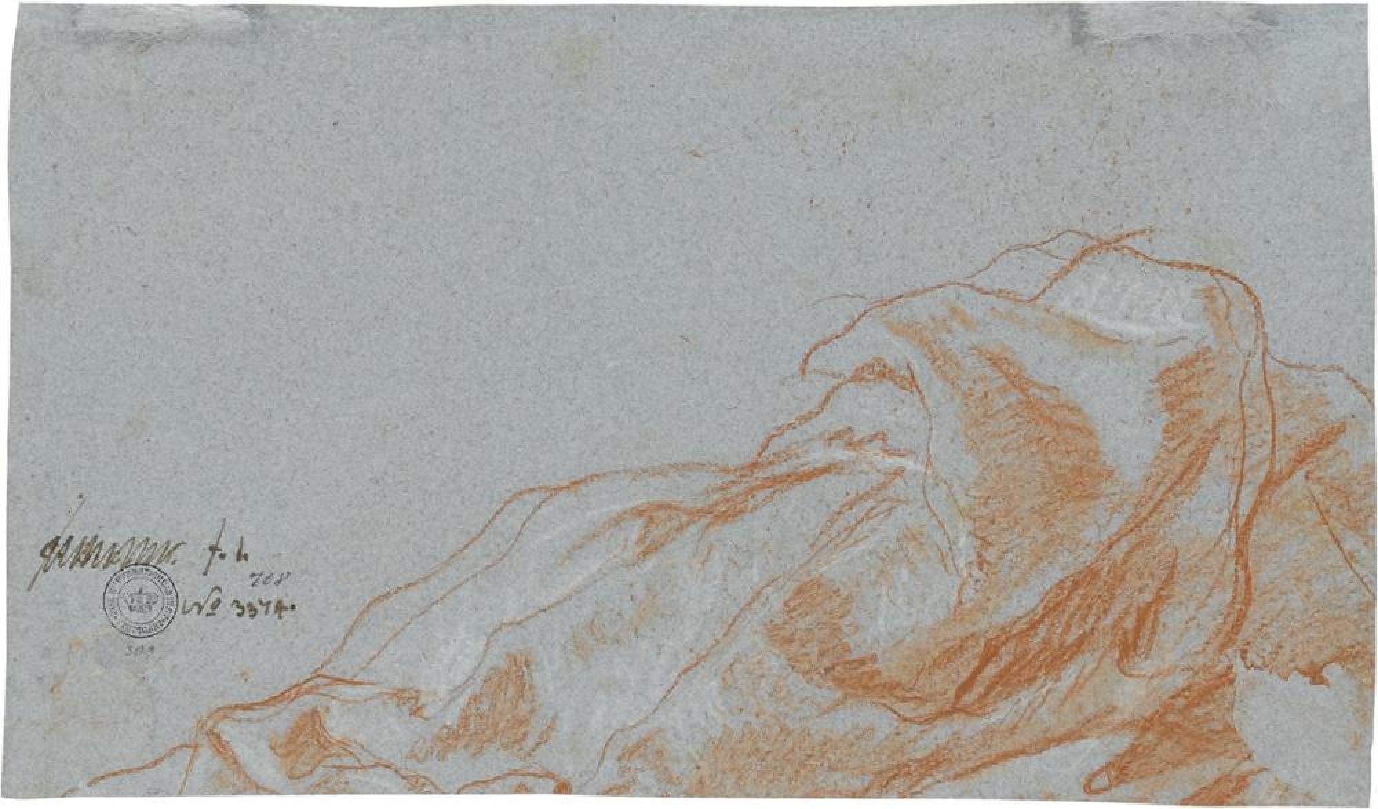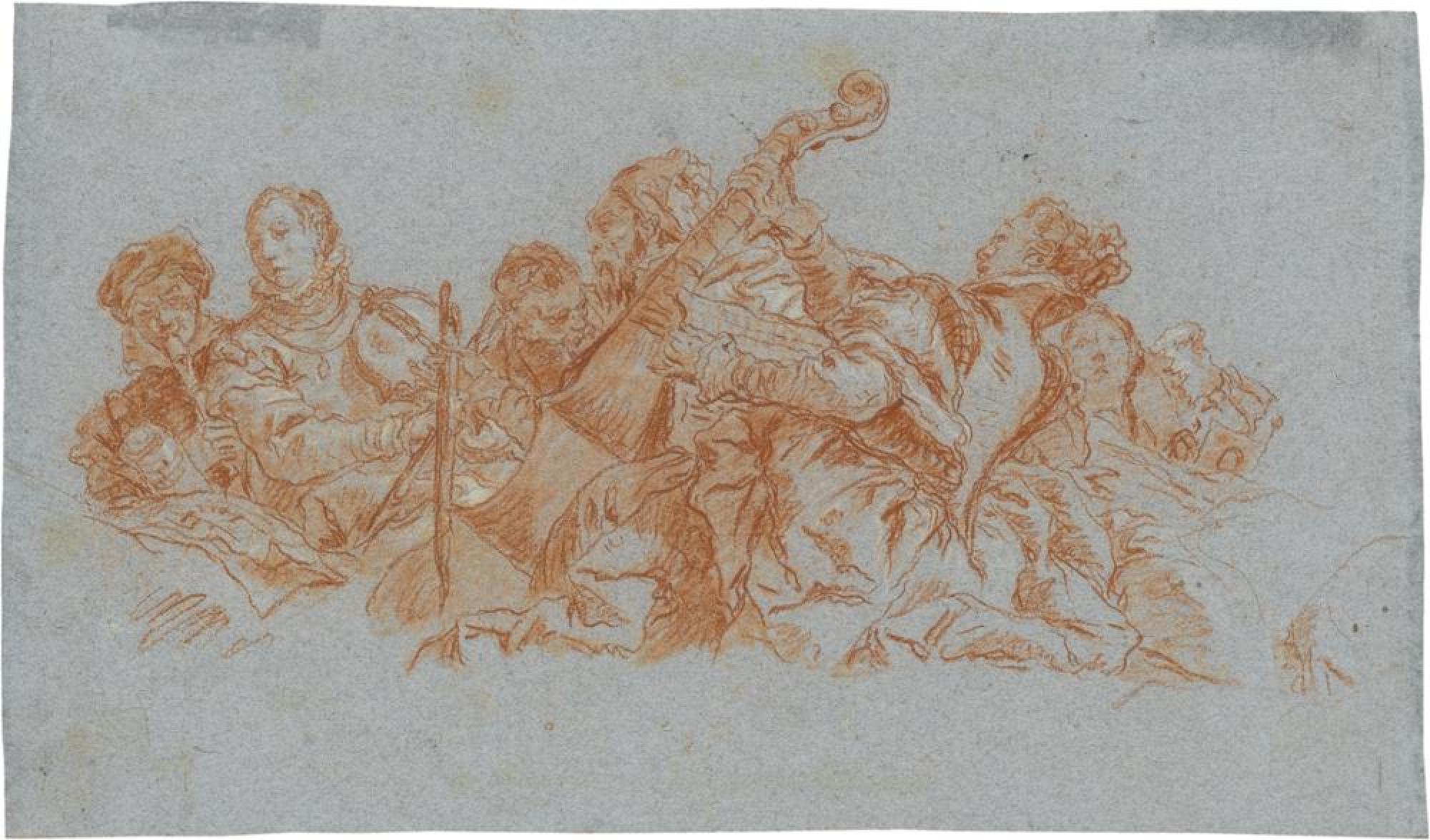 Die dekorativ in der Blattmitte angesiedelte Gruppe von Musikern und Sängern ist ein Ricordo (Nachzeichnung zur Erinnerung) Giovanni Domenico Tiepolos nach dem Detail im »Europa«-Fresko des Treppenhauses zu Würzburg (Massimo Gemin und Filippo Pedrocco: Giambattista Tiepolo. I dipinti. Opera completa, Venedig 1993, Nr. 415; Der Himmel auf Erden. Tiepolo in Würzburg, hg. von Peter O. Krückmann, Ausst.-Kat. Würzburg, Residenz [15.2.-19.5.1996], München und New York 1996, Bd. 1, Abb. S. 116). Mit der Darstellung des Erdteils »Europa« hatte Tiepolo im Sommer 1752 begonnen und zunächst die Decke in den wärmeren Monaten bis zur Hälfte gemalt. In der zweiten Arbeitsphase im Jahre 1753 entstand der andere Teil bis hin zur »Amerika« (Würzburg 1996, Bd. 2, S. 132). Da die Ricordi alle noch auf dem Gerüst entstanden sind, lässt sich das vorliegende Blatt 1752 datieren. Im Vergleich zur Nachzeichnung des Vaters nach dem »Knienden Mann mit Sonnenschirm« (Inv. Nr. C 1470) fällt das kleinteiligere, nervösere Strichbild des Sohnes auf, das auch seinen Federzeichnungen eignet. Doch wie Giovanni Battista (1696-1770) verwischt auch Giovanni Domenico stellenweise die angefeuchtete rote Kreide, um malerische Effekte zu erzielen. Zuweilen benutzt er sie und kräftige, dicht nebeneinandergesetzte Schraffurlinien, um Details, mit denen er offenbar Schwierigkeiten hatte, zu überspielen, was hier vor allem im Gewand der Frau in Rückenansicht rechts augenfällig wird. Auch die meisterhafte Überschneidung der beiden jeweils einen Bogen haltenden Hände der Musiker mit ihren Streichinstrumenten im Fresko erscheint im Ricordo nicht eindeutig geklärt (ebd., Bd. 1, S. 40, Abb. 26). Eine ähnliche Gewandstudie wie auf der Rückseite dieses Blattes findet sich auf dem Verso einer weiteren Stuttgarter Zeichnung (Inv. Nr. C 1481): Beide sind offenbar keine Nachzeichnungen, lassen sich jedoch bisher keinem Gemälde oder Fresko zuordnen.