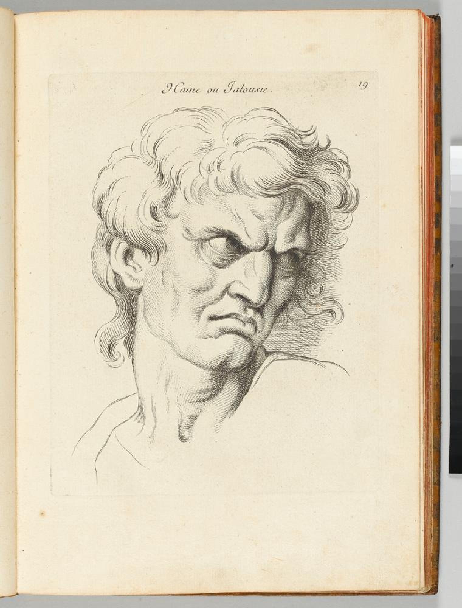 »Haine ou Jalousie« ist eine der heftigsten Leidenschaften in Lebruns Lehre der Affekte. Der in allen Muskeln angespannte Kopf zeichnet sich durch eine starke Verzerrung der Gesichtszüge aus: die gerunzelte Stirn mit nach unten gezogenen Augenbrauen und funkelnde Augen, die halb unter diesen verborgen, zur Ursache dieser Passion blicken. Die geweiteten Nasenlöcher sind deutlich zurückgezogen, so dass Falten auf der Wange hervortreten. Der geschlossene Mund mit stark nach unten gezogenen Mundwinkeln lässt zusammengebissene Zähne vermuten. Dieser männliche Kopf weist, außer dem kurzem, lockigem Haar, keine besonderen Auffälligkeiten auf und gibt auch keine weiteren Hinweise auf Alter, Stand oder bilderzählerischen Kontext. Vorstellbar ist etwa die Verwendung in einem hochdramatischen Historienbild. Mit solchen typisierten Studien gibt Lebrun den Zeichenschülern Beispiele zur Hand, welche bedarfsgerecht modifiziert werden können.
