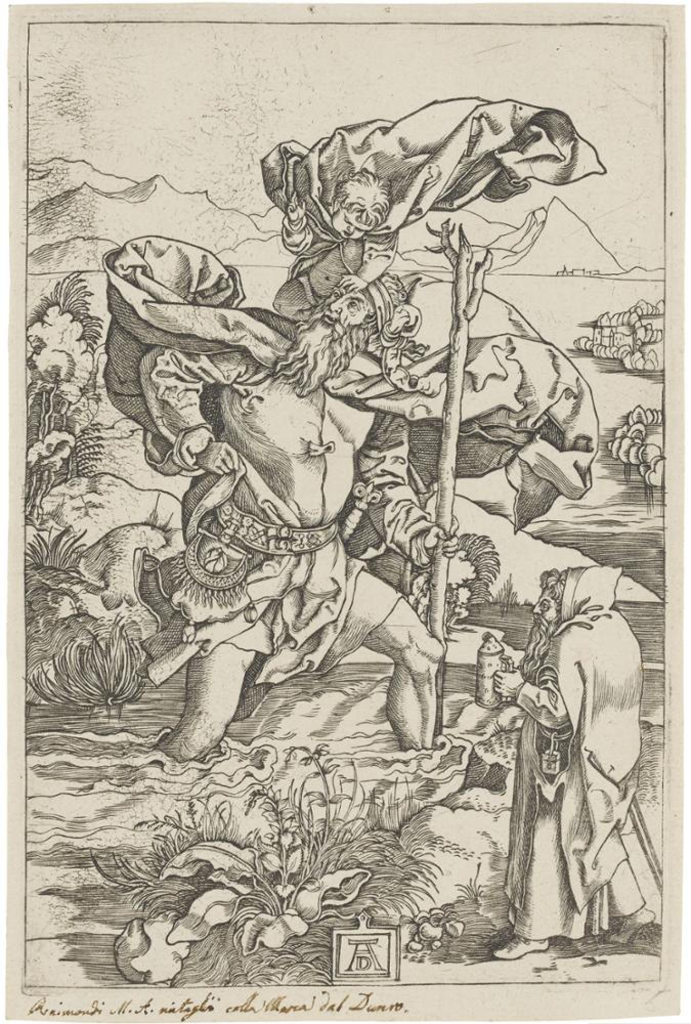 1506 kam Marcantonio Raimondi nach Venedig und sah dort zum ersten Mal Holzschnitte und Kupferstiche von Albrecht Dürer. Er kopierte einige davon, wie hier den »Heiligen Christophorus mit dem Vogelzug«, entstanden um 1503/04 (Inv.Nr. A 3699), versah sie mit dem Dürer-Monogramm »AD« und verkaufte sie. Dürer, der davon Kenntnis erhielt, reiste nach Venedig und verklagte Raimondi vor dem Rat der Stadt. Der erste bekannte Prozess der Kunstgeschichte um »Raubkopien« und das »copyright« endete mit einer Art Kompromiss: Raimondi durfte zwar weiter kopieren, doch das Dürer-Monogramm nicht mehr verwenden. Dürer wiederum schützte sich 1511 bei der Buchausgabe seines »Marienlebens« mit einem Nachdruckverbot: »Wehe dir, Betrüger und Dieb von fremder Arbeitsleistung und Einfällen, laß es dir nicht einfallen, deine dreisten Hände an diese Werke anzulegen! Denn laß dir sagen, daß uns das Privileg durch den ruhmreichsten Kaiser des hl. römischen Reichs, Maximilian, erteilt ist, daß niemand in Nachschnitten diese Bilder drucken oder gedruckt innerhalb des Reichsgebiets verkaufen darf.«