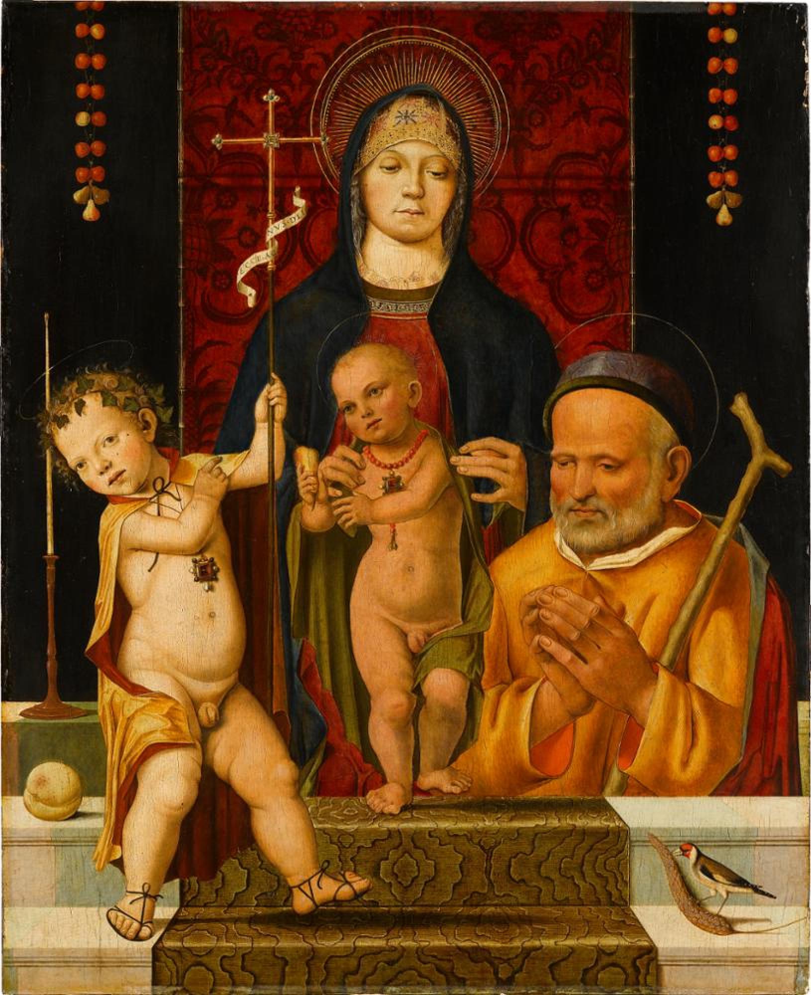 Der überwiegend in Bologna tätige Künstler war Maler und Musiker. Gerühmt wurden seine Bilder vor allem wegen der detailrealistischen Darstellungen von Blumen, Pflanzen, Früchten und Tieren. In seinen wenigen erhaltenen Werke tritt gelegentlich - wie in diesem Gemälde - an die Stelle der Künstlersignatur die Figur eines kleinen Stieglitz. Das Bild ist typisch für Crevalcores Werk: Durch einen Aufenthalt in Ferrara hatte er sich eng mit dem dortigen Kulturkreis um Maler wie Francesco del Cossa, Ercole Roberti und Lorenzo Costa vertraut gemacht. Ebenso finden sich künstlerische Reminiszenzen an die Werke venezianischer Meister, etwa eines Giovanni Bellini und vor allem Carlo Crivellis.