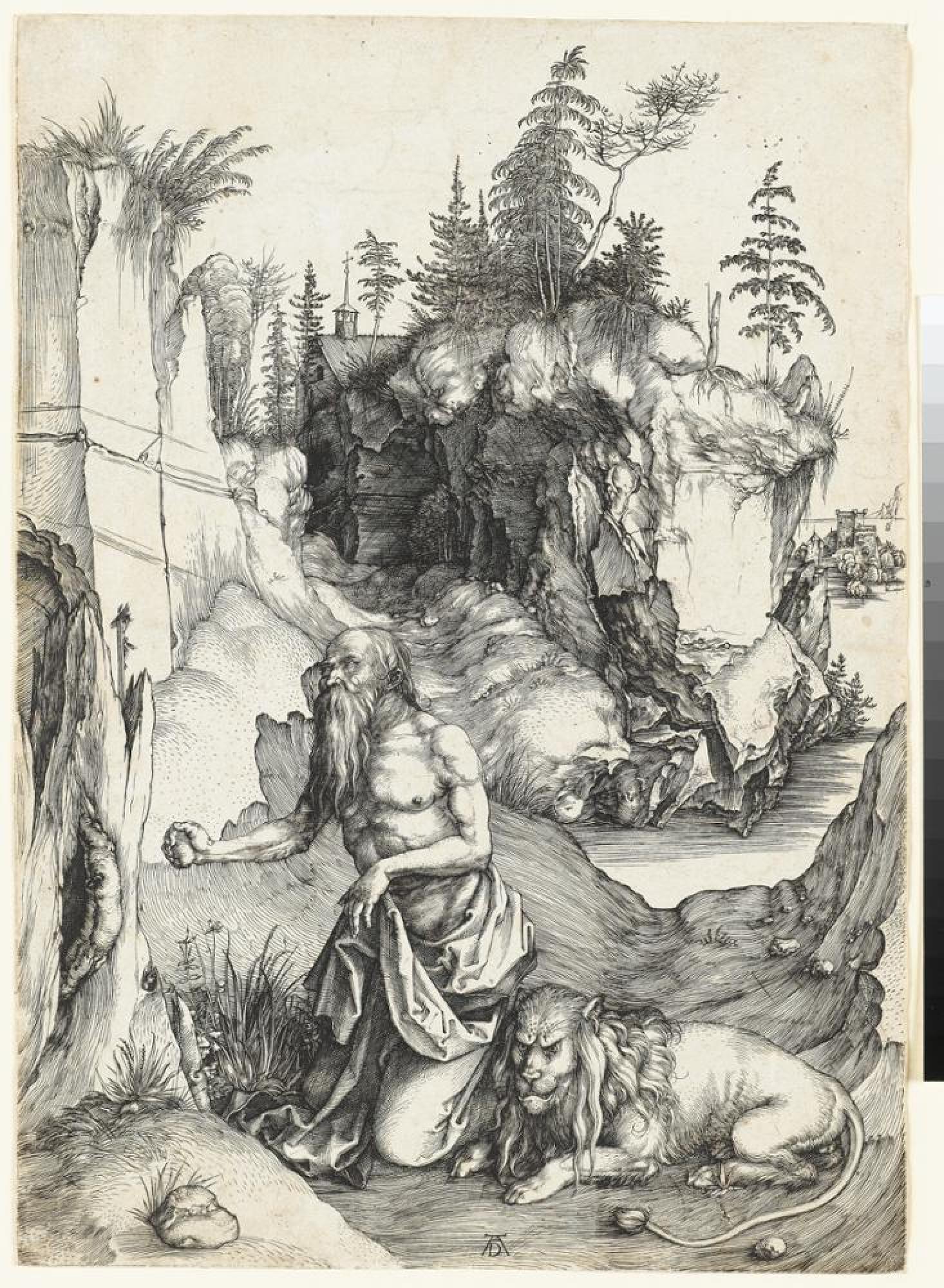 Der heilige Hieronymus, Kirchenvater und Bibelübersetzer, ist mit sechs Darstellungen ein mit Vorliebe behandeltes Motiv in Dürers graphischem Werk. Dieser Kupferstich ist seine früheste Version. Im Laufe des 15. Jahrhunderts wurde dem Heiligen wachsende Verehrung zuteil. Zur gleichen Zeit entstand in Italien ein neuer Bildtypus des büßenden Heiligen in der Einöde - neben dem bekannten, kontemplativen Mönch in seiner Stube (Der heilige Hieronymus im Gehäus, Albrecht Dürers Kupferstich von 1514; Inv. Nr. A 3396). Angeregt wurden die Darstellungen vornehmlich durch Illustrationen der Legenda Aurea des Jacobus de Voragine, Erzbischof von Genua und Schriftsteller aus dem 13. Jahrhundert. Diese Sammlung von Heiligenlegenden erzählt die Geschichte des Hieronymus, der für vier Jahre als Einsiedler in der Wüste lebte. Durch Selbstkasteiung, Fasten, Buße und Gebet entsagte er den Versuchungen der Menschheit. Dürer entwickelt ein eindrucksvolles Bildnis des hageren Asketen inmitten abweisender Natur. Hieronymus kniet, mit langem Bart, freiem Oberkörper und einem Stein in seiner Rechten in einer Sandmulde; versunken einem kleinen Kruzifix zugewandt. Lebloses Gestein umgibt ihn, er ist bedrohlich umrahmt von bizarren Felsen im Mittelgrund. Das Zusammenwirken von Wasser, Land und vermeintlicher Wüste konstruiert eine phantasiereiche Abgeschiedenheit, und dennoch kaschiert Dürer einzelne Schwächen im Übergang der Wege durch die Positionierung und die detaillierte Ausarbeitung der Figur. Zu seiner Seite ruht ein Löwe, dem Hieronymus der Überlieferung zufolge einen Dorn aus der Pranke gezogen habe, und der daraufhin sein folgsamer Begleiter wurde. Oberhalb des Felsgebildes, zwischen dünnen Laub- und Nadelbäumen, erscheint das Dach einer Kapelle; der Felsen steht womöglich als Sinnbild für die Glaubensfestigkeit der christlichen Kirche. Das Werk ist mittig am unteren Bildrand monogrammiert, ein genauer Blick offenbart eine weitere Besonderheit: Dürers frühes, charakteristisch-angewinkeltes »A« und untergestelltes »D«. [D. Teibrich/HMK] Ausstellung: »Albrecht Dürer und Lucas van Leyden. Kunst und Leben um 1500«, 2015/16