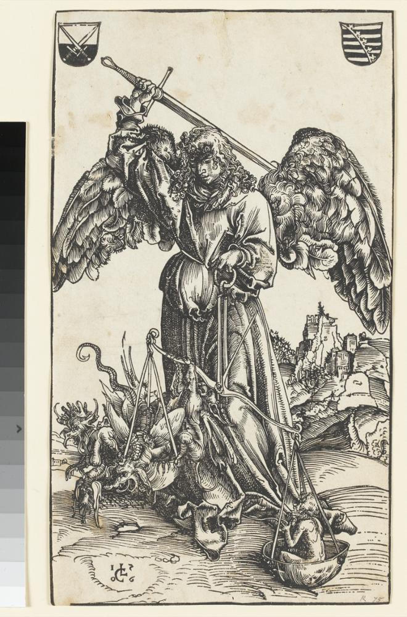 Die Hoffnung, vor dem göttlichen Gericht zu bestehen, so dass Seele die Hölle erspart bleibt, prägte die Menschen seit dem Mittelalter. Im Volksglauben spielte der Erzengel Michael dabei eine zentrale Rolle: als Richter er wägt ab, ob Gut oder Böse überwiegen, und fällt dann das Urteil mit dem Schwert. In der einen Waagschale sitzt die Seele eines Verstorbenen, dargestellt als kleiner nackter Mensch, in der anderen drängen sich höllische Ungeheuer. Die Wage neigt sich zugunsten der Seele - so dient das Bild als Ausdruck des Wunsches nach Errettung. Als Vorlage diente Cranach hier der Kupferstich »Der Erzengel Michael« als Sieger über den Teufel von Martin Schongauer (Inv.Nr. A 5471). Cranachs Holzschnitt zeigt oben die Wappen der Kurfürsten von Sachsen, für die er ab 1505 als Hofmaler tätig war.
