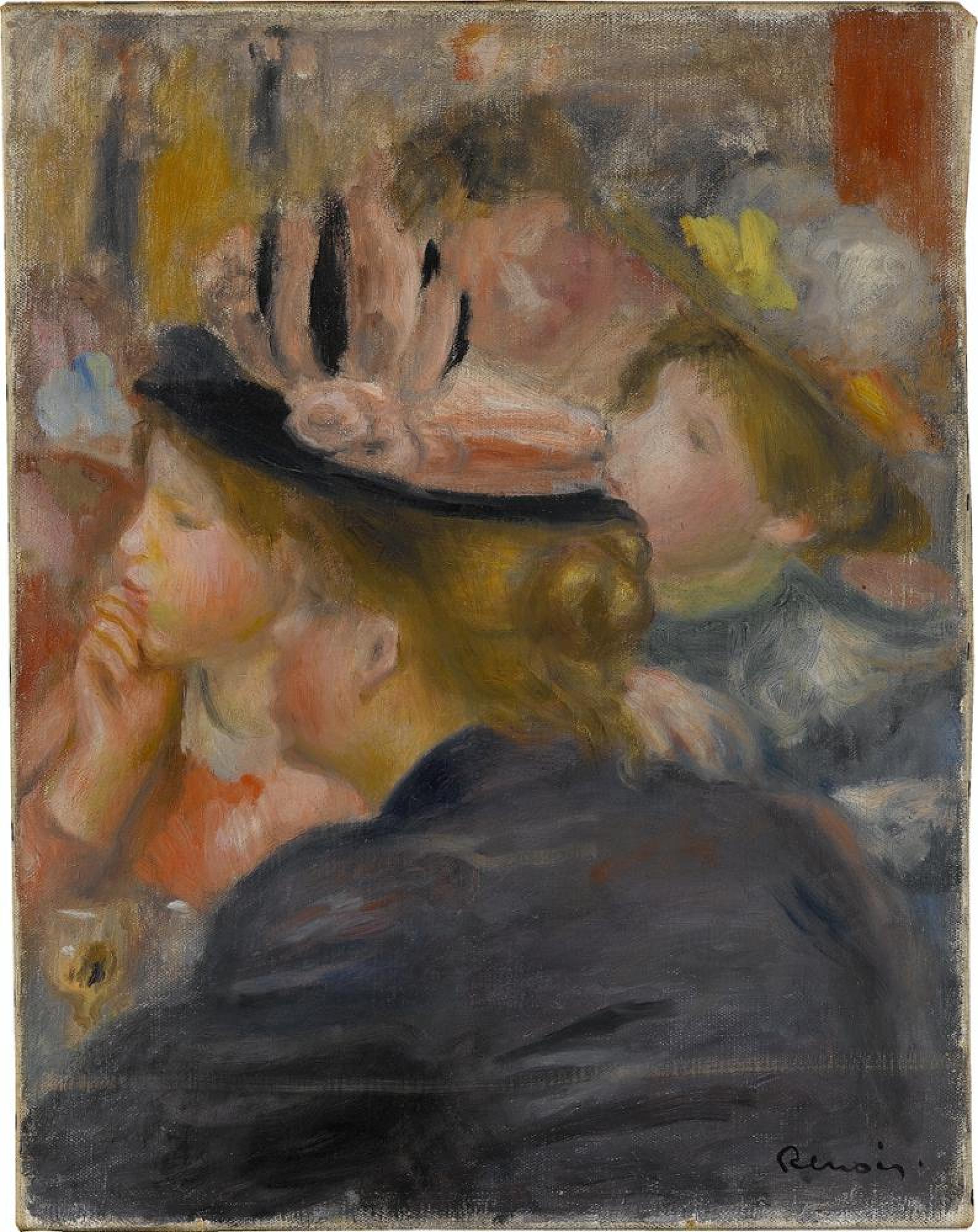 Die Aufmerksamkeit der drei Mädchen richtet sich auf ein Geschehen, das außerhalb des Bildraums liegt. Die dichte Gruppe der Gesichter im Profil vermittelt in porzellanhafter Farbigkeit und im dekorativen Akkord von Grau- und Rosatönen die beschwingte Stimmung in der Loge eines Theaters. Renoirs Freude an der jugendlichen Schönheit spiegelt sich vor allem in der erlesenen pastellhaften Farbigkeit, die typisch für sein späteres Werk ist.