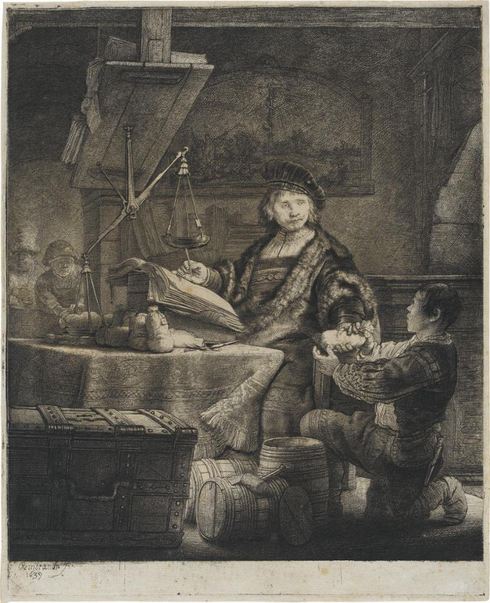 Jan Uytenbogaert (Wtenbogaert, 1608-1680) in Amsterdam war Steuereinnehmer der Provinz Holland, und zugleich ein bedeutender Sammler. In einem außergewöhnlich repräsentativen Porträt stellte ihn Rembrandt als sitzende Ganzfigur in seinem Büro dar. Truhe, Fässer und Geldsäcke verdeutlichen die Beträge, mit denen er hantiert. Ein Diener kniet vor dem prächtig gekleideten Herrn, der die Übergabe des Geldbeutels in seinem Buch notiert. Links im Hintergrund kommen einfache Leute, um ihre Steuern zu bezahlen. Rembrandt hat das Porträt hier zu einer Szene erweitert, die an ältere Bilder von Geldwechslern erinnert; daher rührt der Titel »Der Goldwäger«. Zum Eindruck des Reichtums trägt auch der umfangreiche Gebrauch der Kaltnadel bei, der etwa den Pelz besonders samtig erscheinen läßt, und die insgesamt ›malerische‹ Hell-Dunkel-Wirkung. [HMK]
