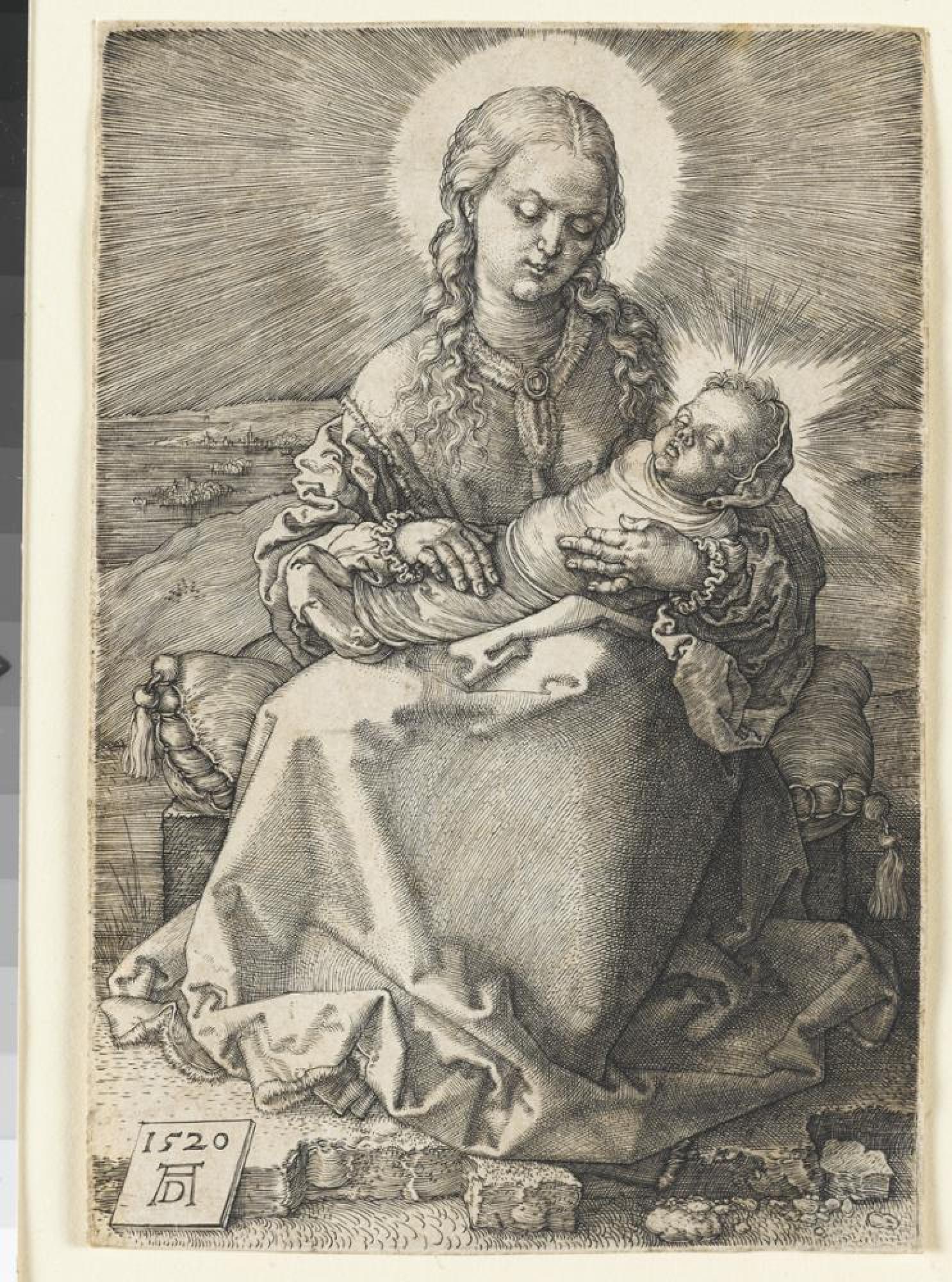Dürers zahlreiche Darstellungen der Maria mit dem Jesuskind zeichnen sich durch innige Zuwendung aus. Zärtlich hält Maria das gewickelte Kind in den Armen, zu dem sie auch ihren Kopf neigt. Ihr Heiligenschein und der kreuzförmige Nimbus des Jesuskindes leuchten hell vor dem eng schraffierten Hintergrund auf. Die subtile Behandlung der Lichter auf dem Gewand hebt die Gruppe geradezu plastisch hervor. Marias Blick deutet nicht nur mütterliche Sorge an, sondern auch das Wissen um die künftige Passion ihres Sohnes. Solche lebensnahen Bilder kamen dem damaligen Bedürfnis nach intensiver religiöser Vergegenwärtigung entgegen. Im gleichen Jahr schuf Dürer auch den Kupferstich »Maria, von einem Engel gekrönt« (Inv. Nr. A 3374). [HMK]