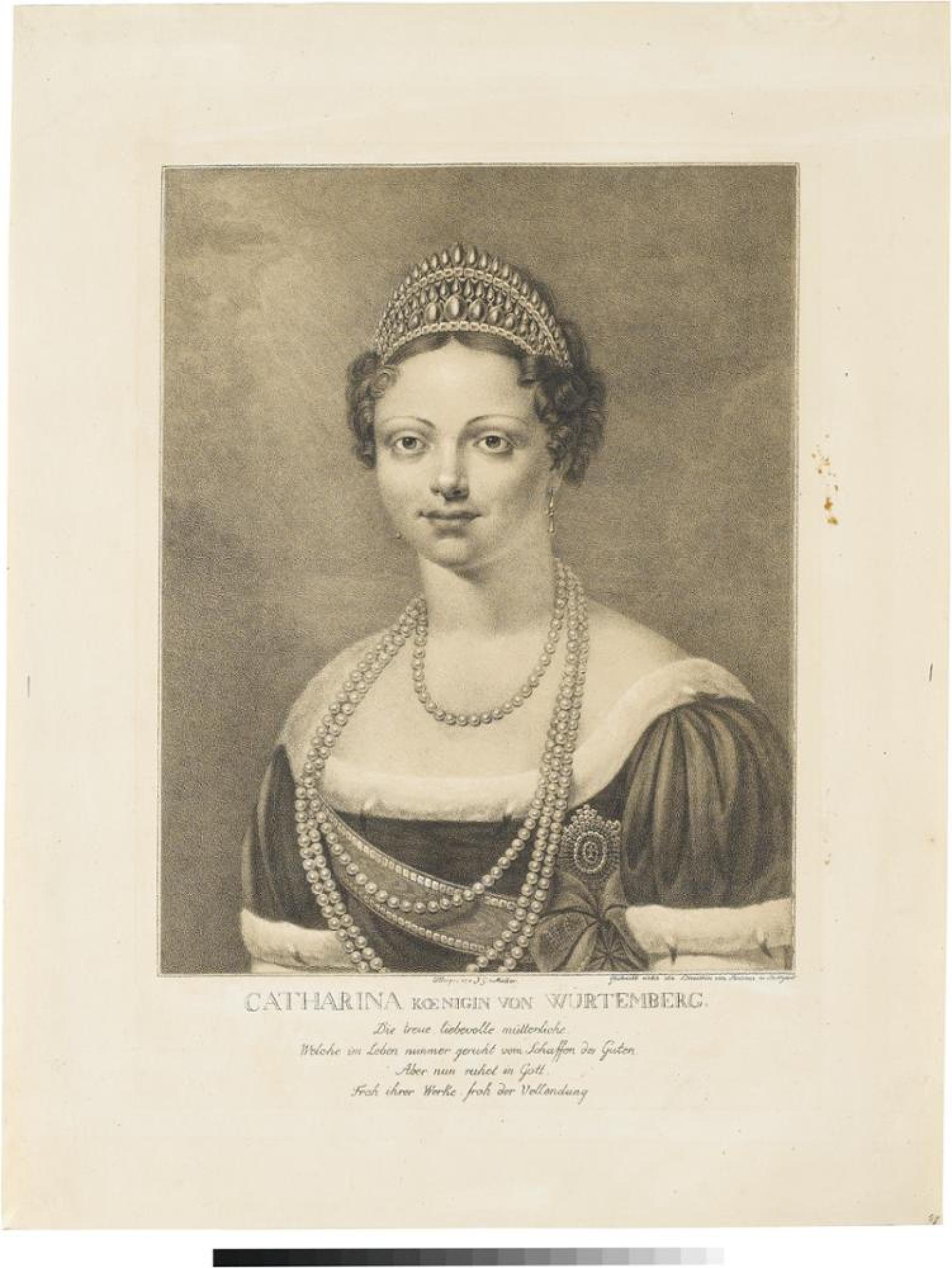 Der vor allem in Frankreich lebende und gefeierte Kupferstecher Johann Gotthard Müller schuf um 1820/21 in dieser Lithographie ein postumes Porträt von Katharina Pawlowna (1788-1819), Ehefrau ihres Cousins König Wilhelms I. von Württemberg (1781-1864). Die Großfürstin war eine Tochter des russischen Zaren Paul (1754-1801) und seiner Ehefrau Maria Fjodorowna, geb. Sophie Dorothee, Herzogin von Württemberg (1759-1828). Die Verbindung zwischen Wilhelm I. und Katharina war auf dem Wiener Kongress 1815 zustande gekommen, nicht zuletzt um das Verhältnis Württembergs, das auf napoleonischer Seite gestanden hatte, zu den ehemaligen Gegnern Russland, Österreich und Preußen zu verbessern. Kurz nach der Eheschließung trat ihr Mann im Oktober 1816 als König die Regierung in einer Notzeit an (Missernten, Teuerung, Hungersnot in Württemberg). Katharina entfaltete eine umfangreiche Wohltätigkeitsarbeit. Nach ihrem frühen Tod ließ Wilhelm I. seiner Frau auf dem Wirtemberg beim Örtchen Rotenberg bei Stuttgart eine Grabkapelle errichten, in der sie 1824 beigesetzt wurde. Auf dem Portal steht geschrieben: »Die Liebe höret nimmer auf«.