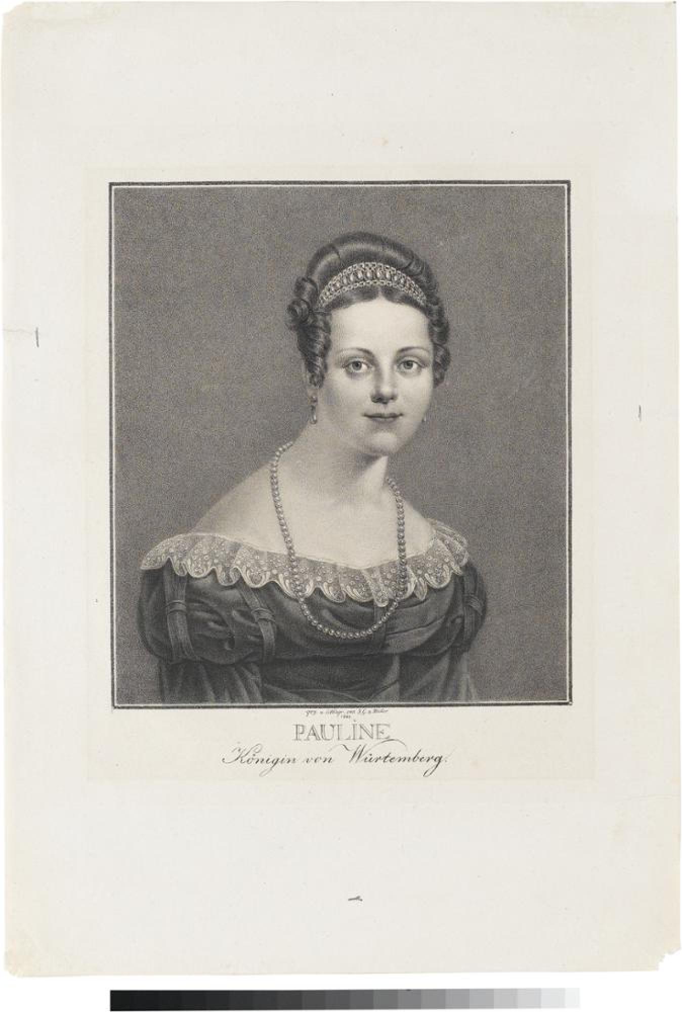 Der vor allem in Frankreich lebende und gefeierte Kupferstecher Johann Gotthard Müller porträtiert 1823 in dieser Lithographie Königin Pauline von Württemberg (1800-1873), die dritte Ehefrau König Wilhelm I. (1781-1864), der ihr Cousin war. Ein Grund für diese Zweckehe war wohl, dass Pauline ihrer Vorgängerin, der jung verstorbenen Katharina Pawlowna (1788-1819), ähnlich sah. Die Verbindung war wenig glücklich, auch wegen des Verhältnisses des Königs mit der Stuttgarter Hofschauspielerin Amalie von Stubenrauch (1805-1876). Nach dem Tode des Königs wurde die Entfremdung des Paares öffentlich: Die Königin war testamentarisch vom Erbe ausgeschlossen, wohl aber erbte Amalie von Stubenrauch. 1823 wurde Paulines und Wilhelms Sohn Karl, ab 1864 König von Württemberg, geboren (gest. 1891). Er heiratete 1846 die Großfürstin Olga (1822-1892), eine Tochter des russischen Zaren Nikolaus I. (1796-1855). Die Zarinmutter Maria Fjodorowna (1759-1828), geborene Prinzessin Sophie Dorothee von Württemberg und Schwester König Friedrichs, war ihre Großmutter.