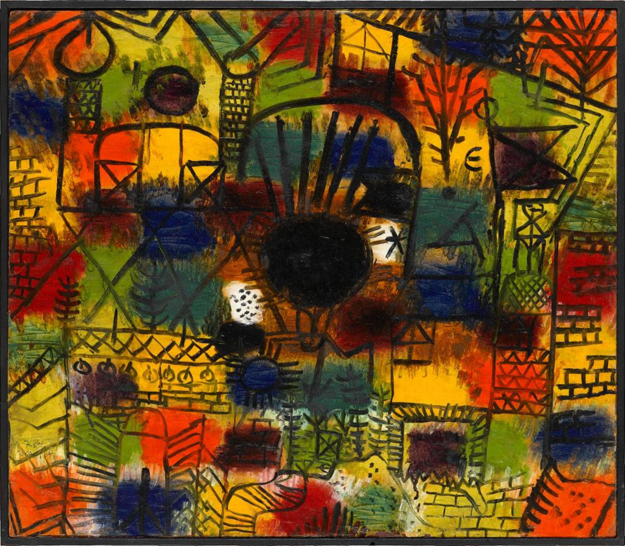 Diese Komposition vereinigt die wesentlichen Stilansätze aus Klees Münchner Zeit. Hinter dem Gittergerüst einer in kindlicher Zeichensprache angedeuteten Phantasiestadt breitet sich ein lockeres Mosaik aus Farbquadraten über die ganze Bildfläche aus. Wie eine verdunkelte Sonne oder ein Brandloch erscheint im Zentrum jener »schwarze Brennpunkt«, in dem das farbige Transparent mit der vorgeblendeten Filigranstadt verschmilzt. Die ornamentale Textur erinnert ebenso wie die tropische Leuchtkraft der schachbrettartig arrangierten Farbelemente an die in Klees Tunis-Aquarellen aus dem Jahre 1914 festgehaltenen orientalischen Impressionen.