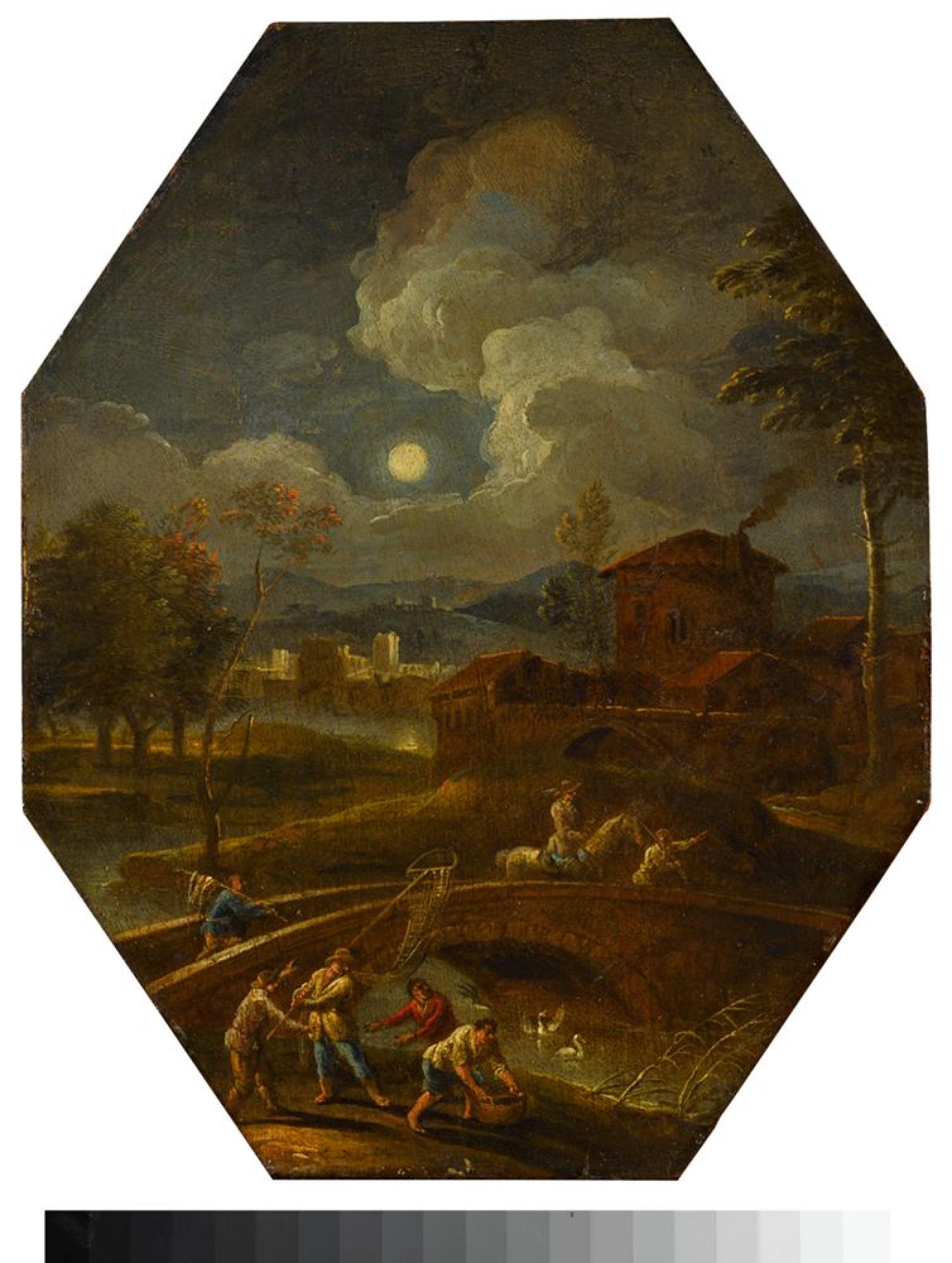 An einer steinernen Brücke haben sich Fischer versammelt, ein Edelmann zu Pferd reitet mit einem Knappen durch die idyllische Landschaft. Die Szenerie ist bei Mondschein gezeigt, der die Umgebung in ein kaltes Licht taucht. Eine ungewöhnliche Wirkung entwickelt daher die Modellierung in verschiedenen Blautönen, denen lokale rote und erdfarbene Farbakzente einen warmen Schimmer verleihen. Die Komposition wird durch Details wie die schräg durch das Bild geführte Brücke dynamisiert und von aufragenden Bäumen gerahmt, die dem Ausblick zusätzliche Tiefe verleiht. Auch die um den Mond greifende Wolkenformation betont die formalen Gegenbewegungen im Bild und macht es lebendig. Diese besonderen Elemente wurden im 19. Jh. mit dem lothringischen Kupferstecher Jacques Callot (1592-1635) verbunden, sind aber auch in der italienischen Landschaftsmalerei typische Gestaltungsmerkmale. Das ungewöhnliche achteckige Format und der pastose Farbauftrag waren auch im 18. Jh. eine beliebte künstlerische Ausdrucksorm.
