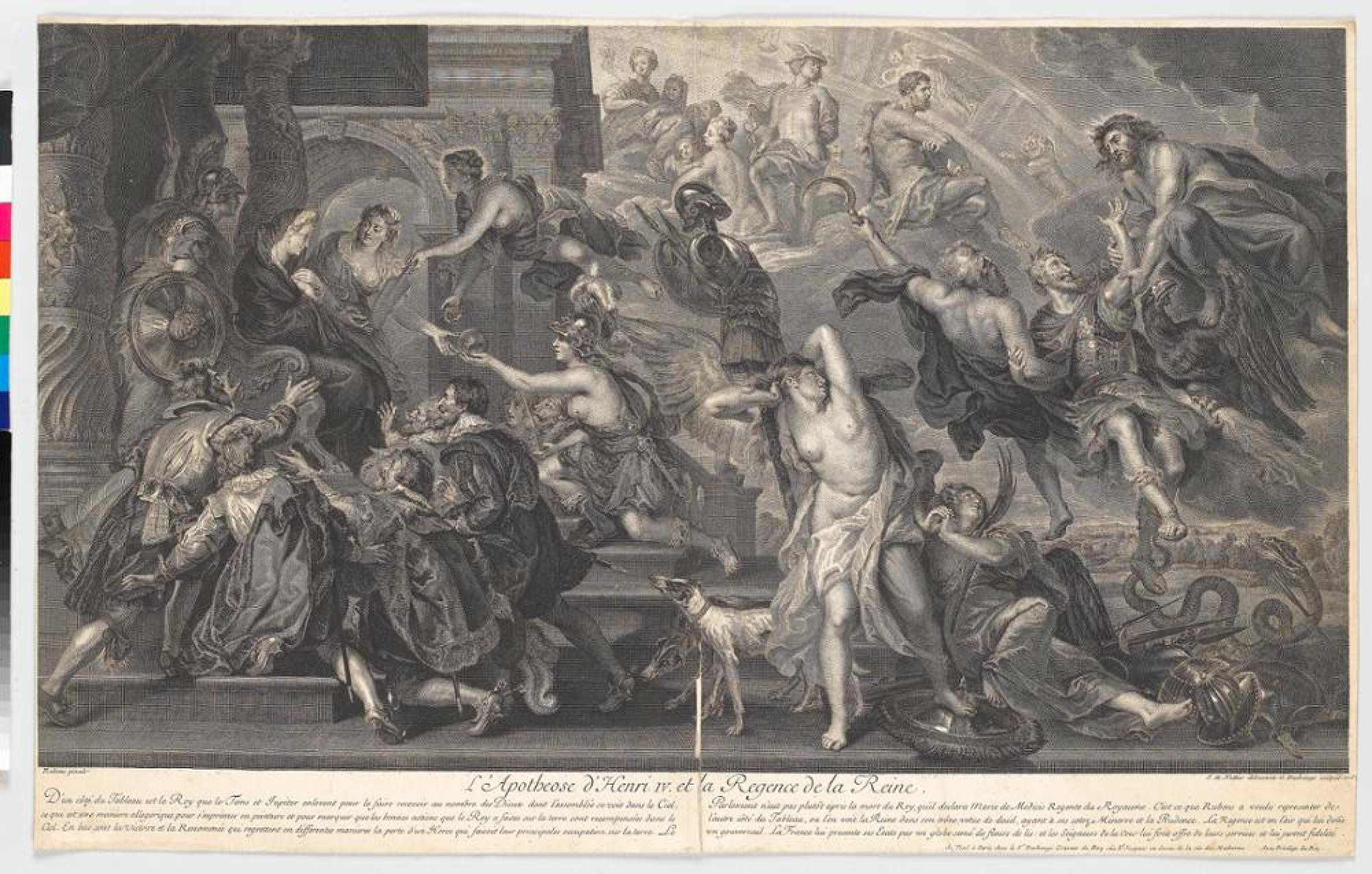 Rubens schildert König Heinrichs Apotheose: Jupiter und Saturn tragen ihn in den Götterhimmel. Maria de' Medici sitzt bereits auf dem Thron; die Vertreter des Parlaments berufen sie zur Regentin. Von der Personifikation Frankreichs erhält sie den Globus als Herrschaftszeichen, aus dem Himmel das Steuerruder als Regierungssymbol. Das Gemälde gehört zu den großen, querformatigen Bildern im Zentrum des »Medici-Zyklus« (Inv. Nr. A 19971).