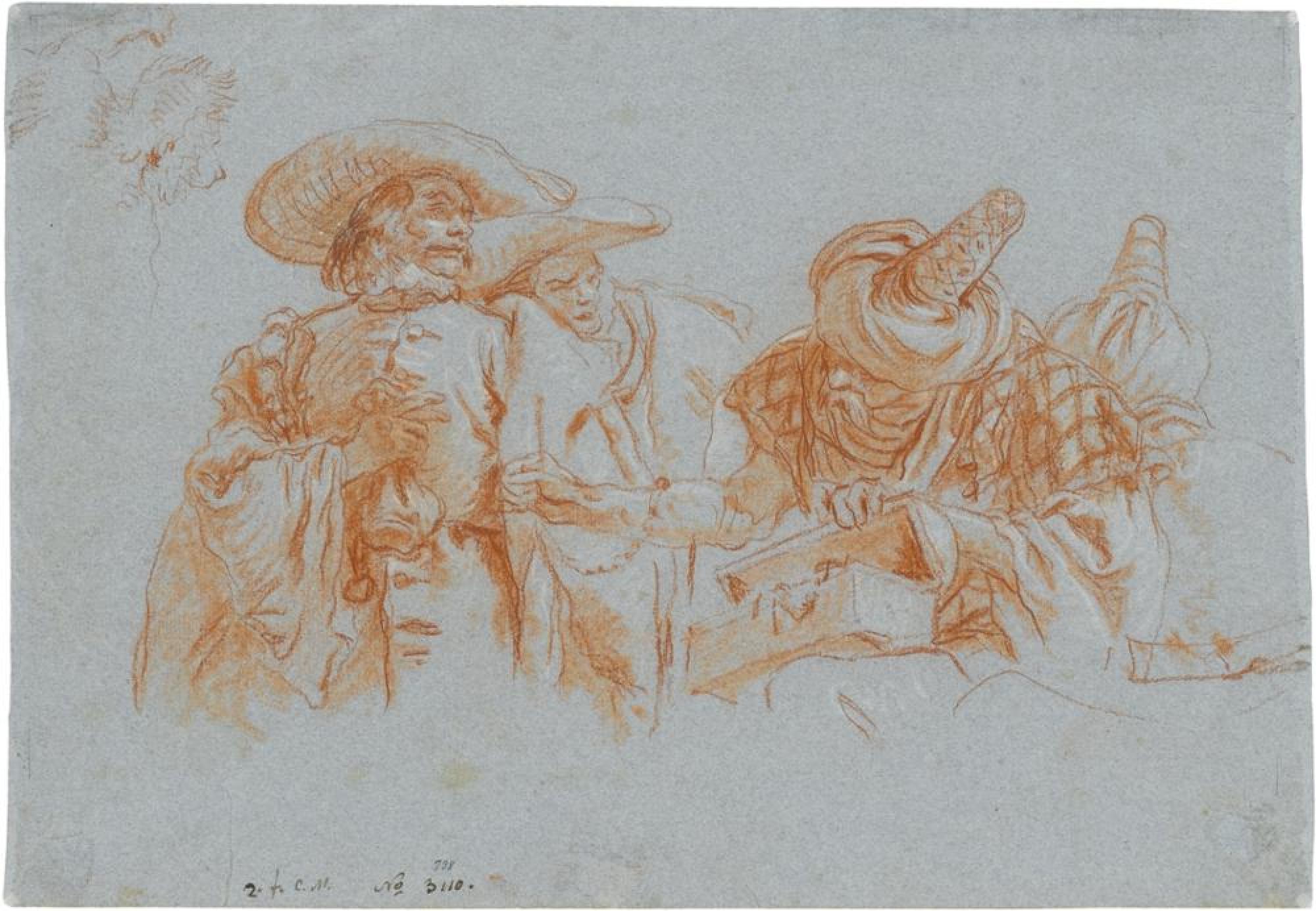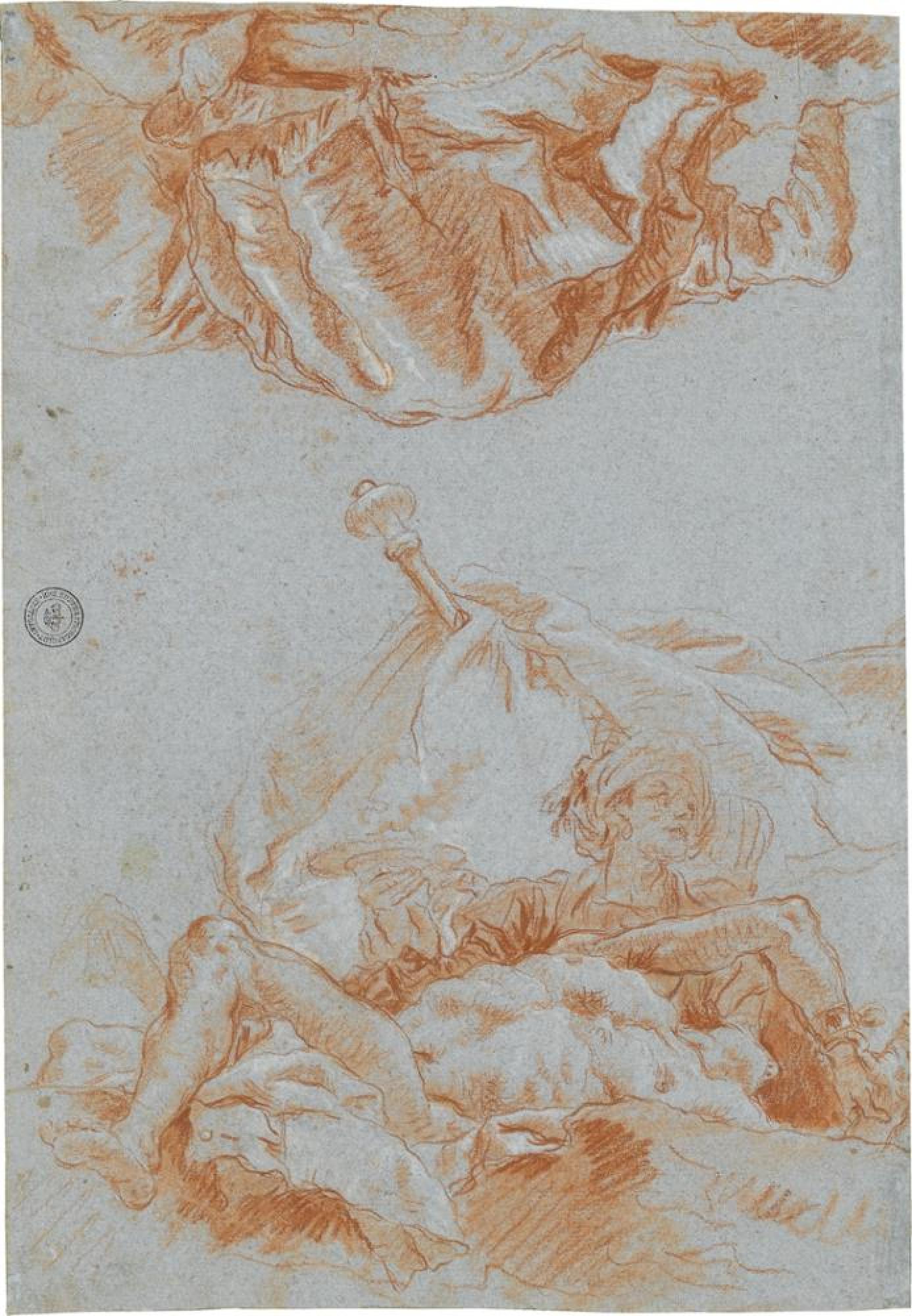 Giovanni Domenico Tiepolo zeichnet in diesem Ricordo (Nachzeichnung zur Erinnerung) zwei Figuren aus der »Asia« des Würzburger Treppenhausfreskos nach, darunter zunächst 1752 den liegenden gefesselten Sklaven links unterhalb der Personifikation des Erdteils Die schwach angedeuteten Hände neben seinem Knie gehören bereits zu der Gestalt in Rückenansicht, die auf der Rückseite einer weiteren Stuttgarter Zeichnung wiedergegeben ist (Inv. Nr. C 1477). Während der Arbeit der Familie Tiepolo am zweiten Abschnitt des Deckenbildes 1753 nahm Giovanni Domenico das Blatt erneut zur Hand und beschäftigte sich nun, auf dem gedrehten Papier, mit dem Mann, der sich zu Boden geworfen hat, aus dem rechten Teil des Freskos. Nur schemenhaft erscheint daneben die zweite Figur in Proskynese (Massimo Gemin und Filippo Pedrocco: Giambattista Tiepolo. I dipinti. Opera completa, Venedig 1993, Nr. 415; Der Himmel auf Erden. Tiepolo in Würzburg, hg. von Peter O. Krückmann, Ausst.-Kat. Würzburg, Residenz [15.2.-19.5.1996], München und New York 1996, Bd. 1, Abb. S. 112-113). Auf der Rückseite finden sich die Gruppe mit dem »Schmuckhändler« aus dem »Afrika«-Fresko sowie links oben, nur skizzenhaft erfasst, der Kopf des Affen (ebd., Bd. 1, Abb. S. 108-109). Somit gehört die Rückseite des Blattes in die Reihe der Zeichnungen nach der »Afrika«, die in Stuttgart am vollständigsten von allen Partien der Würzburger Treppenhausdecke in Ricordi dokumentiert ist (Inv. Nr. C 1470, C 1473, C 1479 recto, C 1484 recto, C 1499, C 1477 verso, C 1482 verso, C 1478 recto und verso, C 1480 verso, C 1490 verso). Der Ricordo nach dem »Mann, der sich zu Boden geworfen hat« diente später dem Vater in der Vorbereitungsphase des Deckenbildes von 1760/61 für die Villa Pisani in Strà, denn dort kehren nicht nur die Figur des auf dem Rücken liegenden Sklaven, sondern auch die beiden Männer, die sich zu Boden geworfen haben, fast wortwörtlich wieder (Gemin/Pedrocco 1993, Nr. 511). Vermutlich erinnerte sich Giovanni Battista (1696-1770) auch an diese Figur im Zusammenhang mit zwei Gemälden aus der spanischen Zeit, die sich heute in der Sammlung der Duchessa di Villahermosa in Pedrola befinden (ebd., Nr. 535, 536). Auch Giovanni Domenico zitierte die Figur ein weiteres Mal in seinem Bozzetto zur »Himmelfahrt Mariae« von 1793; im ausgeführten Fresko in Cartura erscheint die Gestalt jedoch etwas verändert (Adriano Mariuz und Ivano Cavallaro: Giandomenico Tiepolo a Cartura, Padua 1993, S. 1-34, Abb. 13-16). Die Gestalt des Sklaven findet sich ebenso, etwas variiert, jedoch mit vergleichbarer Arm- und Beinhaltung, im 1752 datierten »Engelssturz« wieder, einem Altarbild, das Giovanni Battista Tiepolo für die Würzburger Residenzkapelle schuf (Gemin/Pedrocco 1993, Nr. 416).