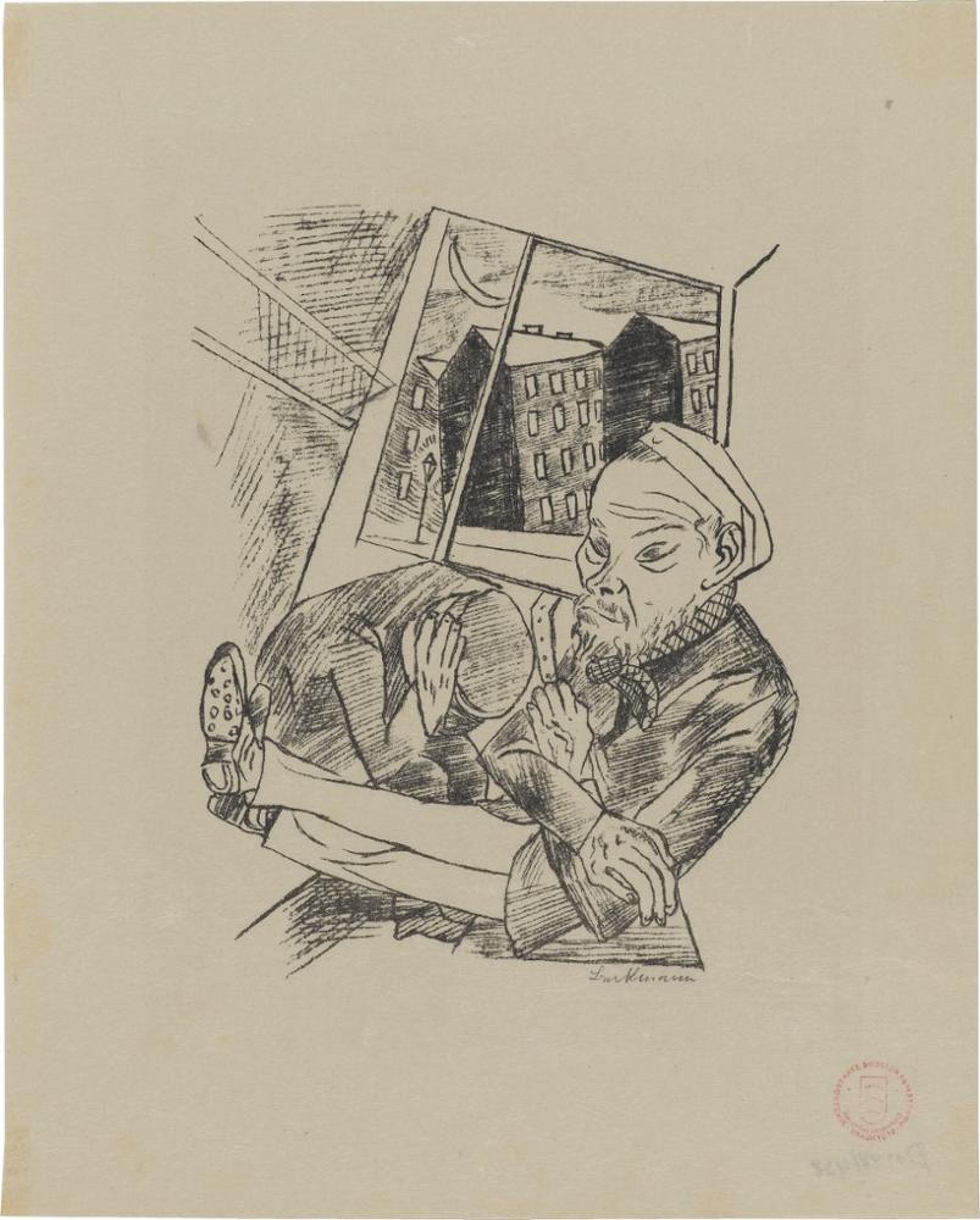 Die Darstellung illustriert das Gedicht »Vorstadtmorgen« von Lili von Braunbehrens: »Auf der Strasse steht die Pfützen. Darin die gelben Lichterreihen. Noch einmal die Zirkeleien Fahl erzittern in dem Dreck. Schwarze Häuser, unbarmherzig, Blaue Flammen starr und schrill. Und es pfeift in den Gebäuden. Greulich giesst es durch den Morgen, Durch den nassen Morgenhimmel. Jeder neue TagWird so angetutet. Ja, des Winters auch Geht man mit den Semmeln, Schleppt der Zug uns noch halb schlafend in die Vorstadt, Die vom Nachtdienst abzulösen.« 1917 erwirkte Major von Braunbehrens Beckmanns endgültige Entlassung aus dem Militärdienst nach dessen Nervenzusammenbruch 1915. Noch in diesem Jahr lernte der Künstler in Frankfurt a.M. beim Maler Ugi Battenberg und seiner Frau Fridel, bei denen er bis 1921 lebte, die halberblindete Tochter des Majors, Lili von Braunbehrens, kennen gelernt. Für die Publikation von 20 ihrer Gedichte steuerte der Beckmann sechs Illustrationen sowie das Titelblatt bei.