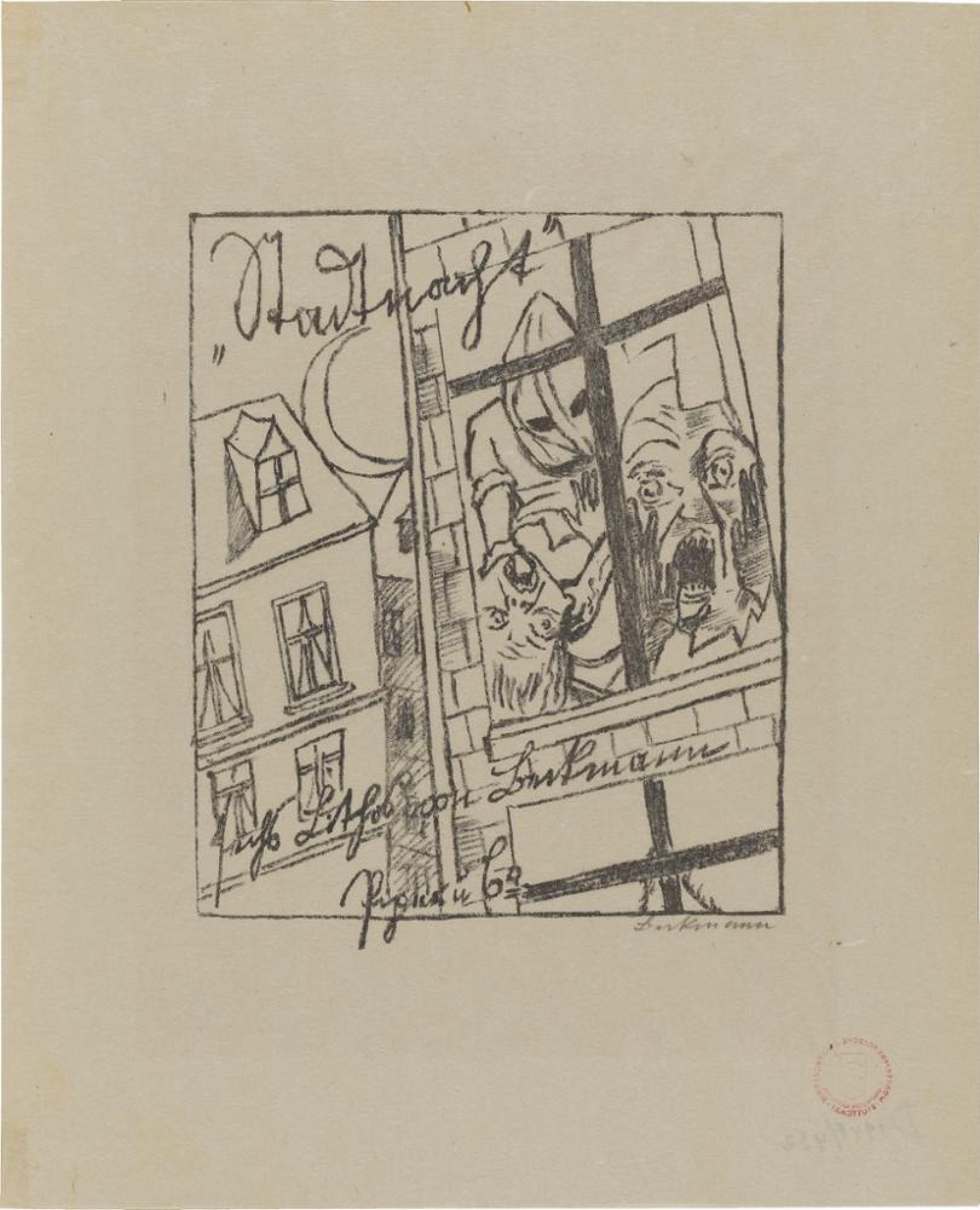In einem der Häuser, zwischen denen die Mondsichel als Zeichen für die Nacht, wie eingeklemmt wirkt, findet hinter einem schwarzen Fensterkreuz, dem Symbol des Todes, findet eine brutale Vergewaltigung durch einen Maskierten statt, der die Frau zudem würgt. Rechts erscheint das Gesicht eines hilflosen, durch die geborstene Fensterscheibe schreienden Mannes, vielleicht ein »Selbstbildnis« Max Beckmanns. Doch nicht nur der Geschlechterkampf in seiner gewaltsame Sexualität wird thematisiert, sondern auch allgemein der Kampf zwischen dem Rationalen und Animalischen, zwischen Zivilisation und Urtrieb, zwischen Gehirn und Geschlecht. 1917 erwirkte Major von Braunbehrens Beckmanns endgültige Entlassung aus dem Militärdienst nach dessen Nervenzusammenbruch 1915. Noch in diesem Jahr lernte der Künstler in Frankfurt a.M. beim Maler Ugi Battenberg und seiner Frau Fridel, bei denen er bis 1921 lebte, die halberblindete Tochter des Majors, Lili von Braunbehrens, kennen gelernt. Für die Publikation von 20 ihrer Gedichte steuerte der Beckmann sechs Illustrationen sowie das Titelblatt bei.