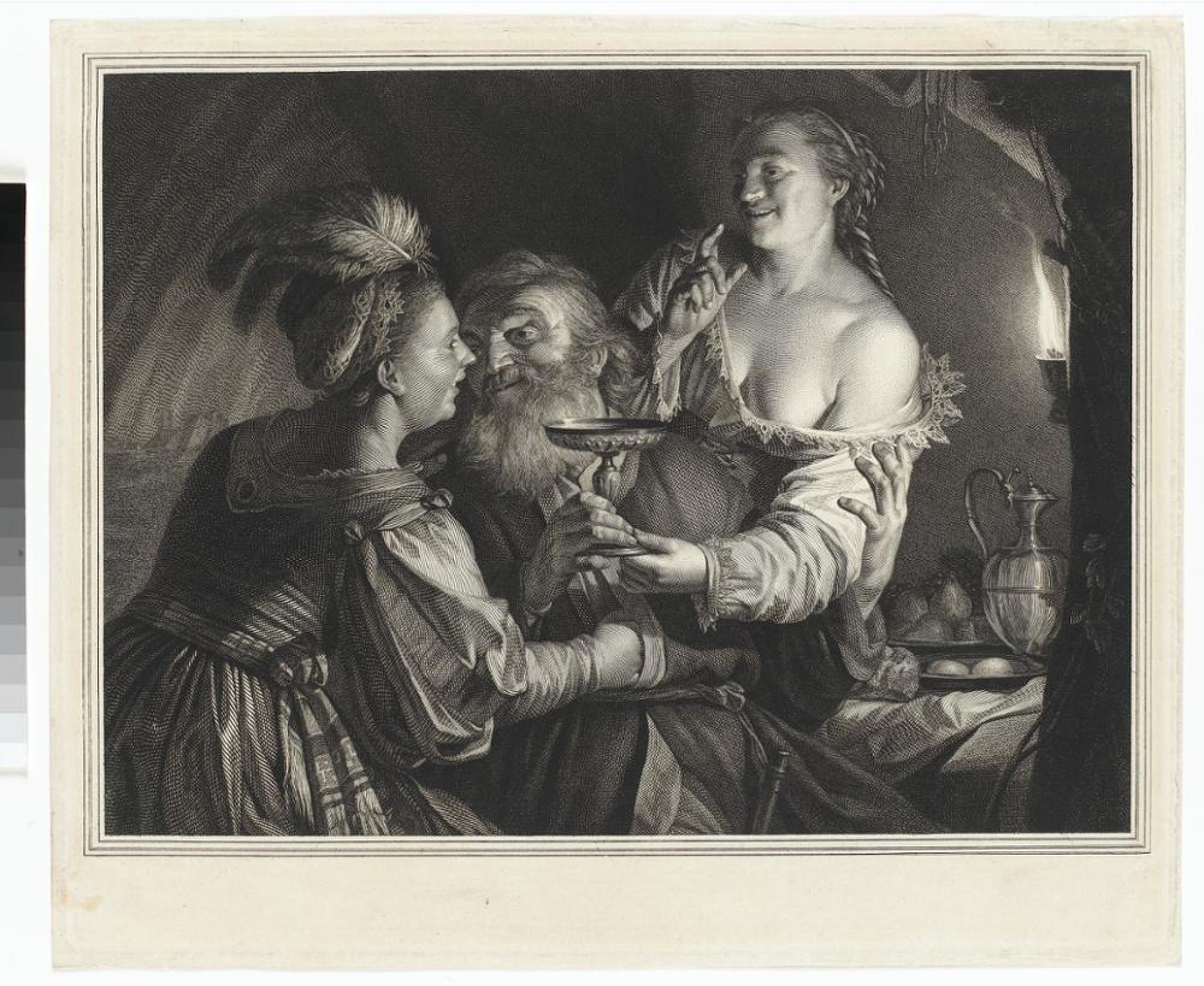 Im Unterschied zu seiner Zeichnung (Inv.Nr. C 7052) nach dem Gemälde von van Honthorst legt Müller im Kupferstich den Grundton deutlich dunkler an. Dabei steigert er den Hell-Dunkel-Kontrast, etwa den Lichtfleck auf der Nasenspitze der Tochter rechts. Gleichzeitig gelingt es ihm, feinste Schattennuancen zu übertragen wie an der rückwärtigen Wand der Höhle, an der sich gerade noch der Lichtschein der Kerze erahnen lässt. Zudem ist die Szene jetzt, ihrer Übertragung auf eine Druckplatte entsprechend, gespiegelt und von einem aus drei Linien bestehenden Rahmen umzogen. Dieser Probedruck »vor der Schrift« lässt unten Platz für Text. Im endgültigen Zustand (Inv.Nr. A 50126) stehen dort dann Titel, Widmung und die Angaben zu Maler, Stecher und Publikationsdatum.