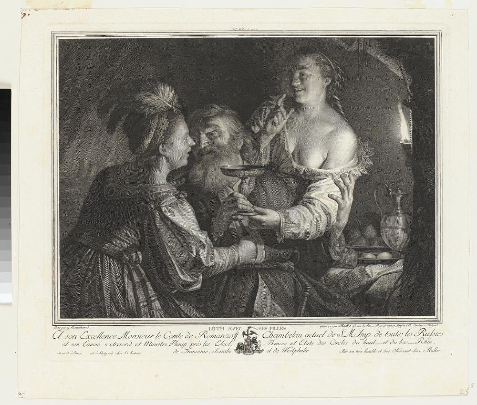 Das dem Alten Testament entstammende Motiv (1. Mose 24-36) war in Renaissance und Barock verbreitet: Loth flieht mit seinen Töchtern aus Sodom, das Gott ob seiner Sünde untergehen ließ. Überzeugt, dass alle Männer dem Feuer zum Opfer gefallen seien, geben die Töchter ihrem Vater Wein zu trinken und verführen ihn, um das Fortleben der Familie zu sichern. Müller reproduziert hier ein (nicht mehr bekanntes) Gemälde des niederländischen Malers van Honthorst: Loth wird von seinen Töchtern flankiert, deren eine ihm Wein reicht, während die andere ihm schon die Hand unters Gewand gelegt hat. Den Kupferstich bereitete er mit Zeichnung und Probedrucken vor (Inv.Nr. C 7052, A 50124). Licht-und Schatten, feinste Nuancen geben den Stil des »Caravaggismus« wieder, den Honhorst in Utrecht pflegte. In diesem endgültigen Zustand stehen unten Titel, Namen der Künstler und Widmung, zur internationalen Vermarktung in französischer Sprache.