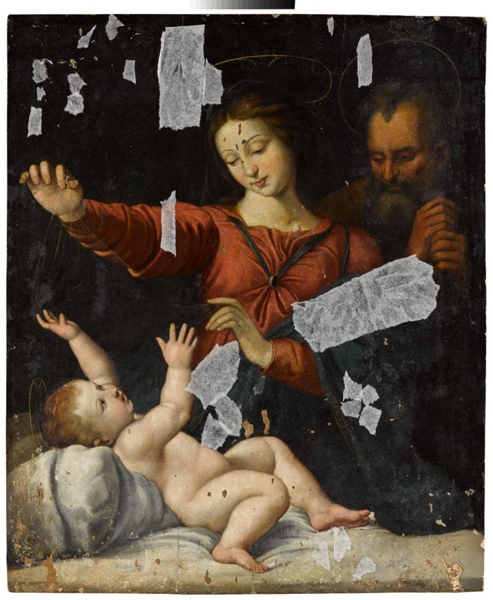 Das auf Leinwand gemalte Bild zeigt die Muttergottes, die einen nahezu transparenten Schleier von ihrem Sohn hebt, der spielerisch nach dem Tuch greift. Hinter ihr lehnt der Ziehvater Joseph auf einen Stab gestützt und blickt auf den Knaben. Das Bild ist eine von zahlreichen Kopien der sogenannten »Madonna von Loreto«, die von dem italienischen Renaissancemaler Raffael (1483-1520) kurz nach seiner Ankunft in Rom um 1511 gemalt wurde. Vermutlich wurde sie von Papst Julius II. (reg. 1503-1513) in Auftrag gegeben und bis ins späte 16. Jh. in der Kirche Santa Maria del Popolo aufbewahrt. Auch nachdem Raffaels Original in die römische Privatsammlung der Borghese-Familie überging, wurde das berühmte Vorbild vielfach kopiert. Heute befindet sich das Original im Musée Condé in Chantilly. Bei der Stuttgarter Werk handelt es sich wohl um eine ältere Kopie des 16. oder 17. Jhs. handeln. Im Gegensatz zu Raffaels Gemälde ist sie betont graphisch angelegt, Konturen- und Schattenverläufe sind mit einer Klarheit und Schärfe modelliert, die dem Renaissance-Werk fehlt. Das Gemälde wurde bereits im 19. Jh. mehrmals restauriert. Es stammt aus der privaten Sammlung König Wilhelms I. von Württemberg und wurde dem Museum 1860 geschenkt.