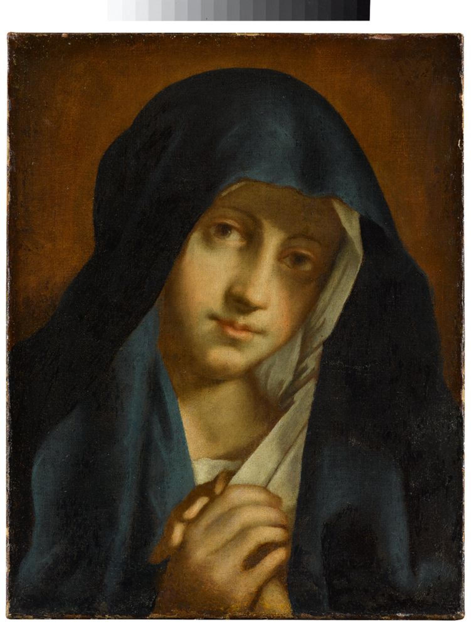 Mit zum Gebet gefalteten Händen blickt Maria, die Mutter Jesu, auf die Betrachter. Ihr mit einem Schleier und einem blauen Tuch verhülltes Haupt gehört zu einem Lebensabschnitt aus dem Leben Christi, das sich mit seiner Passion verbindet. Die Klage der Mutter um den toten Sohn unter dem Kreuz ist eines der wichtigsten Motive der christlichen Andacht, das den Gläubigen das Nachempfinden der Leiden Christi ermöglichen sollte. Das Motiv der beinahe porträthaft aus dem Bild blickenden Gottesmutter richtet sich an die Gläubigen und soll sie zum Gebet animieren. Also sogenannte »Schmerzensmutter« (»Mater dolorosa«) dient das Gemälde der Kontemplation verschiedener Stationen im Marienleben, die mit insgesamt schmerzlichen Erfahrungen verbunden werden und seit dem Spätmittelalter zur katholischen Gebetspraxis gehören. Das Andachtsbild selbst wurde in der Mitte des 19. Jhs. mit dem italienischen Barockmaler Giovanni Battista Salvi, genannt Sassoferrato (1609-1685) verbunden, der für seine elegante Malweise und andächtigen Marienbilder berühmt war. Bei dem Stuttgart Werk handelt es sich hingegen um eine der zahlreichen Kopien, die im späten 17. und 18. Jh. von den populären Madonnen angefertigt wurden.