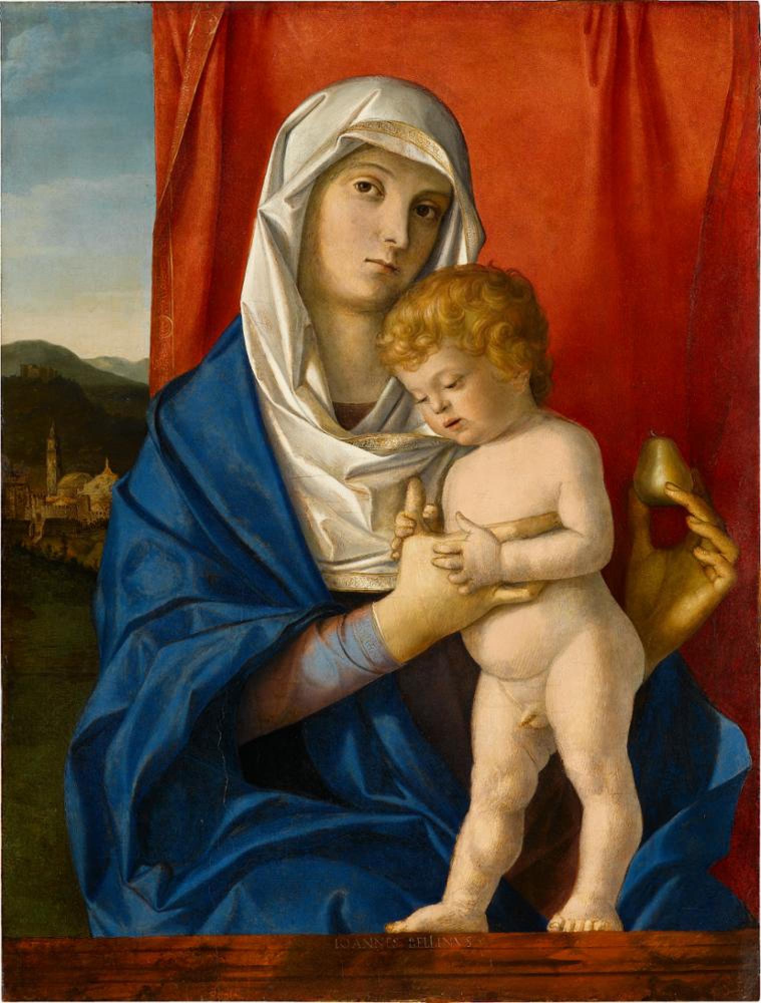 Maria sitzt hinter einer Brüstung und blickt nachdenklich zu uns. Mit ihrer rechten Hand stützt sie das Christuskind, während sie in ihrer Linken eine Birne hält, die – wie auch der Apfel – auf die Erbsünde von Adam und Eva verweist. Eingebettet in eine weite Landschaft ist im Hintergrund die Stadt Vicenza dargestellt mit dem Dom und der Torre della Bissara. Solche Landschaften mit markanten, wiedererkennbaren Bauwerken sowie weiteren zeitgenössischen Motiven finden sich häufig in Werken Giovanni Bellinis, der auf diese Weise die christlichen Themen für die Betrachterinnen und Betrachter seiner Zeit aktualisierte. Obwohl das Gemälde nicht mehr sehr gut erhalten ist, sprechen die hohe malerische Qualität einiger Partien und vor allem die detaillierte Unterzeichnung dafür, dass es sich um ein authentisches Werk Giovanni Bellinis unter Beteiligung seiner Werkstatt handelt.