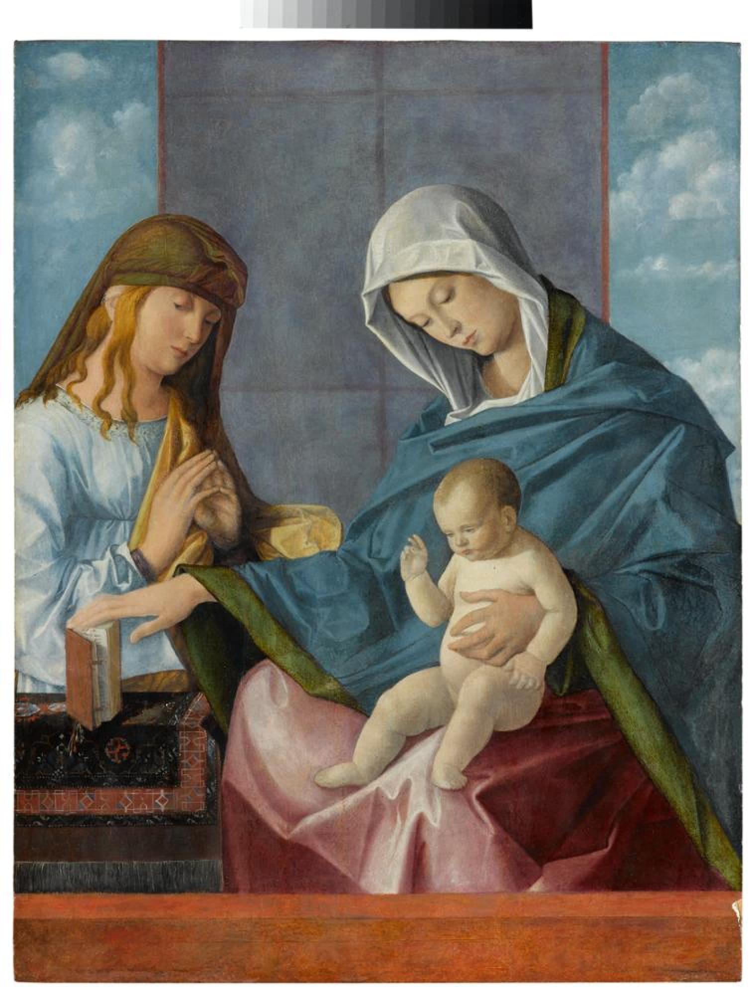 Das private Andachtsbild zeigt die Gottesmutter hinter einer niedrigen Brüstung, welche die Grenze zwischen himmlischer und weltlicher Sphäre markiert. Versonnen blickt sie auf ihr Kind, das sein Händchen zu einem Segensgestus erhoben hat. Eine noch nicht identifizierte, weibliche Heilige wendet sich betend Christus zu. Das Gemälde wurde 1852 mit der Sammlung Barbini-Breganze als Werk des Giovanni Bellini angekauft. Es handelt sich jedoch um die Arbeit des Künstlers Vincenzo Catena, der sich an der Malerei und den Bildkompositionen Giovanni Bellinis orientierte. So lässt sich die Figurengruppe der Madonna mit Kind auf eine Zeichnung der Bellini-Werkstatt beziehen, die heute in den Florentiner Uffizien aufbewahrt wird. Die weiche Modellierung der Körper und Gewänder sowie die atmosphärisch und stimmig wirkende Malerei zeigen die hohe Kunstfertigkeit des Malers.