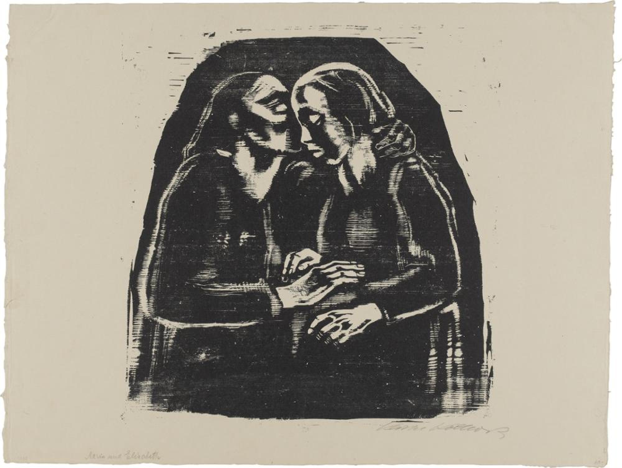 Der Holzschnitt ist die dritte Fassung des Themas, das Käthe Kollwitz auch in Zeichnungen vorbereitete (vgl. Inv.Nr. C 1954/GVL 38). Es geht zurück auf die Begegnung mit dem Gemälde von Konrad Witz »Der Ratschluss der Erlösung«, das die Künstlerin im Kaiser-Friedrich-Museum (heute Bode-Museum) in Berlin gesehen hat. Im Tagebuch findet sich zudem bereits am 28.6.1921 der Eintrag: »Gertrud und Ottilie [d.i. die Schwiegertochter von Käthe Kollwitz] heute wie Elisabeth und Maria. Beide hochschwanger.« Der Abzug der Stuttgarter Sammlung entstammt der Auflage im Euphorion-Verlag von 1930. Käthe Kollwitz schrieb dazu an Dr. Heinrich Becker am 15.1.1930: »Der Euphorion Verlag hat den Stock erworben. Noch sind keine Auflagedrucke hergestellt, da es ein sehr weiches, schwer zu behandelndes Holz ist. Die Auflage wird schon aus diesem Grunde sehr klein sein (150 Drucke).«