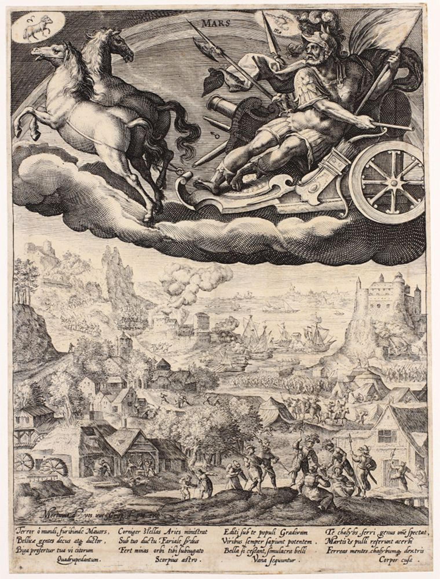 Das Blatt gehört zu einer von Crispijn de Passe I nach Entwürfen von Marten de Vos gestochenen Serie der sieben Planetengottheiten mit vorangestelltem Titelblatt. Gemäß der Tradition fahren die Gottheiten in Wagen durch den Himmel und beherrschen so die von ihren jeweiligen »Kindern« bevölkerte irdische Welt. Die Bildunterschriften charakterisieren die Gestirne und ordnen ihnen je ein Metall zu. Mars erscheint unter den Tierkreiszeichen Steinbock und Skorpion. Geharnischt und mit wehender Fahne in der Hand, lenkt er seinen robusten und mit verschiedenen Waffen beladenen Wagen, dem zwei Pferde vorgespannt sind. Zugordnet sind ihm die Metalle Stahl und Eisen. In der Landschaft unter dem Wolkenband zeigt sich dies auch an den Schmieden, in denen offenbar Waffen hergestellt werden. So weisen ihn auch über die Landschaft verteilte Kampfszenen zu Land und zu Wasser als Gott des Krieges aus.