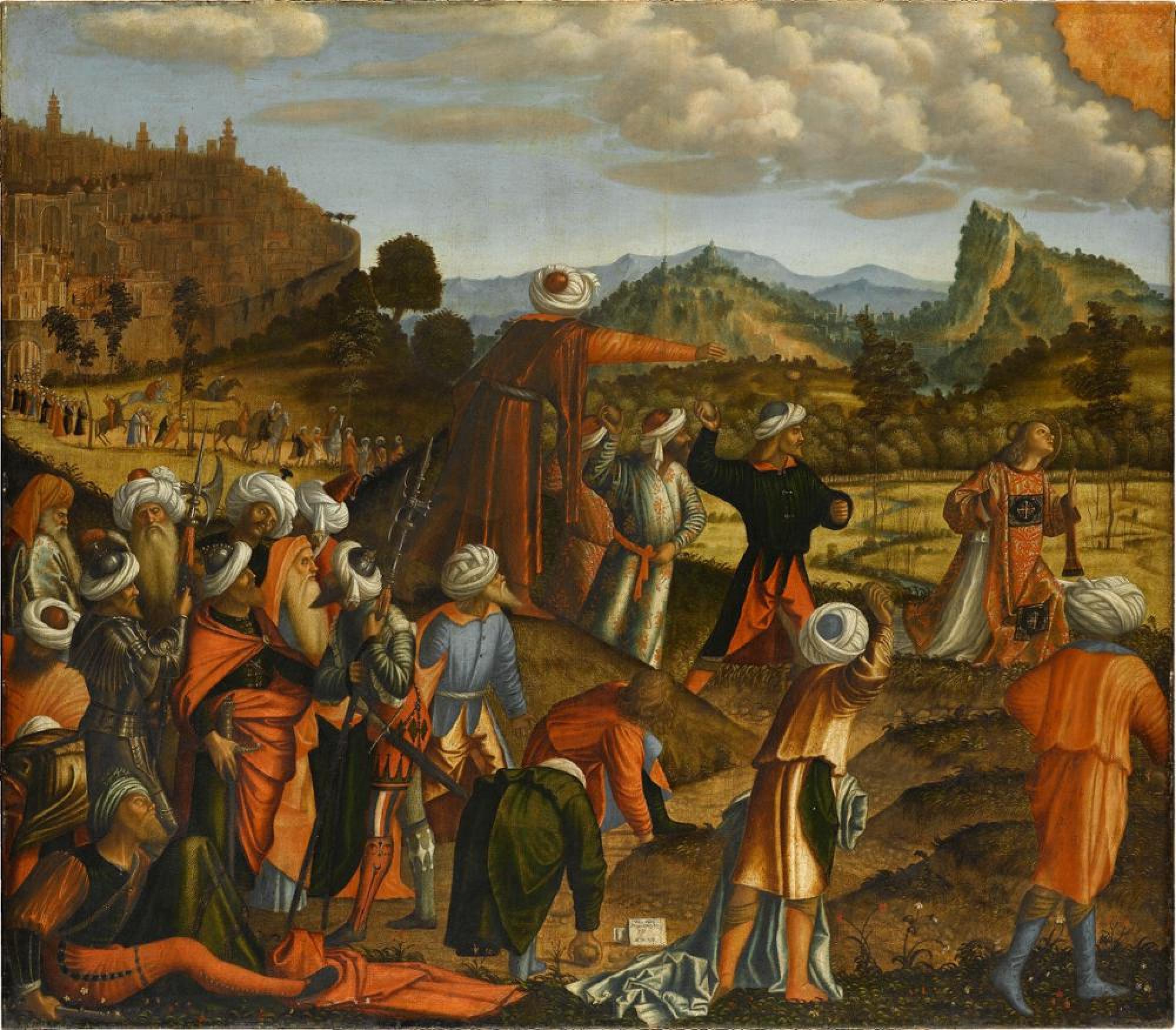Erzählfreudige, detailreiche Ereignisbilder aus dem Leben von Heiligen sind die Spezialität des venezianischen Malers Vittore Carpaccio. Dieses Gemälde gehört zu einem fünfteiligen Zyklus, den er von 1511 bis 1520 für die Scuola di Santo Stefano in Venedig schuf (weitere Bilder befinden sich in Berlin, Paris und Mailand, eines ist verschollen) und zeigt die Steinigung des heiligen Stephanus. Im Gemälde dominieren die Steine werfenden Feinde den Vordergrund, während Stephanus am Rand kniet und seinen Blick zum Himmel richtet. Einige seiner Peiniger tragen Turbane oder andere eine nordalpine Rüstung – ein Verweis auf die unterschiedlichen politischen Bedrohungen Venedigs um 1500. Zugleich vermittelt das Bild die versöhnlichen Ideale der wohltätigen Stephanus-Bruderschaft, die das Gemälde in Auftrag gab: Stephanus bittet, die »Herrlichkeit Gottes« erblickend, im Gebet um Vergebung für seine Feinde. Carpaccio setzt das Martyrium vor eine Ansicht Jerusalems, die er einem zeitgenössischen Reisebericht entnimmt.