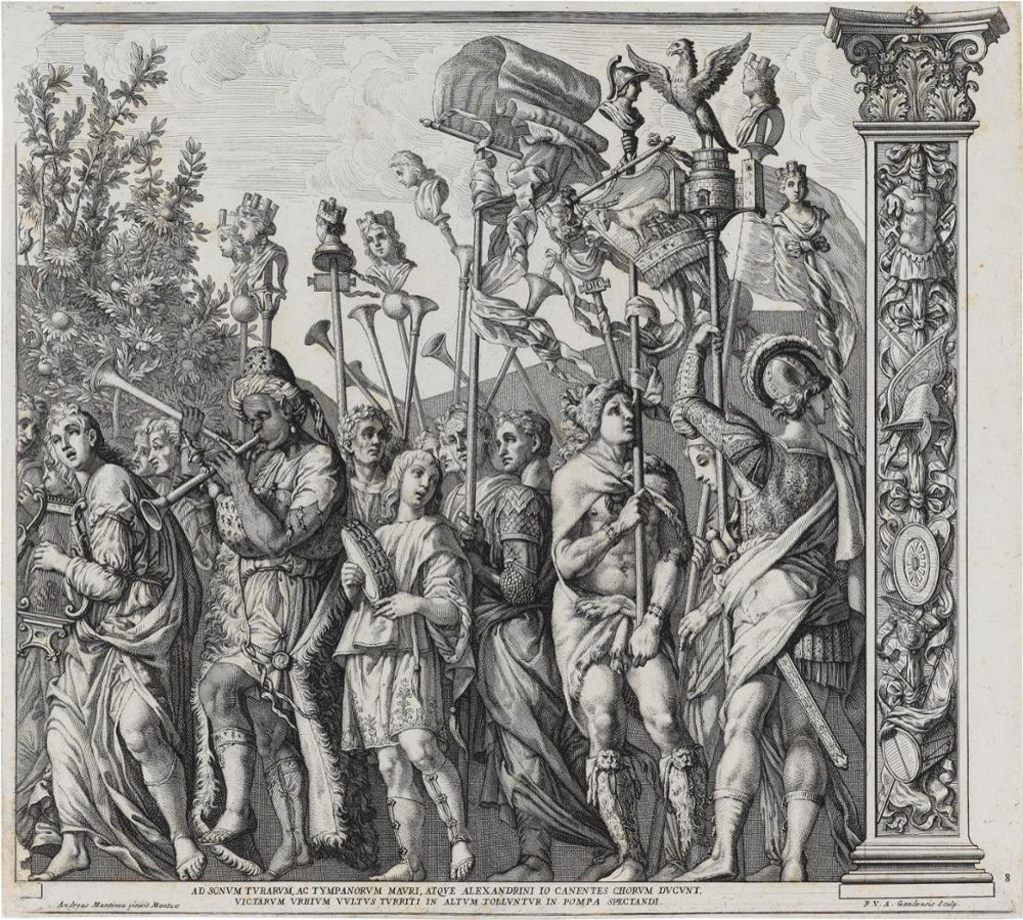 1692 schuf Robert van Audenaerde im Auftrag des Verlegers Domenico de' Rossi die Kupferstichfolge nach den Gemälden zum »Triumphzug Caesars« von Andrea Mantegna. Als Vorlage dienten ihm vor allem die Chiaroscuro-Holzschnitte von Andrea Andreani (Inv.Nr. A 22689-A 22698), die originalen Gemälde, die seit 1631 bereits in England waren, hat er nie gesehen. Andrea Mantegnas Gemäldezyklus »Triumphzug Caesars«, entstanden zwischen 1484 und 1492 vermutlich im Auftrag des Giovanni Francesco II. Gonzaga, Herzog von Mantua, für den »Corridoio del Passerino« des Palazzo della Corte. 1512 wird der Zyklus erstmals im neuen Palast der Gonzaga bei San Sebastiano erwähnt, wo ihn auch Andrea Andreani noch gesehen hat, bevor er in den Palazzo Ducale überführt wurde. Seit 1631, nachdem Charles I. 1629 den größten Teil der Gonzaga-Sammlung erworben hatte, befinden sich die Bilder im Besitz des englischen Königshauses und werden in Hampton Court aufbewahrt.