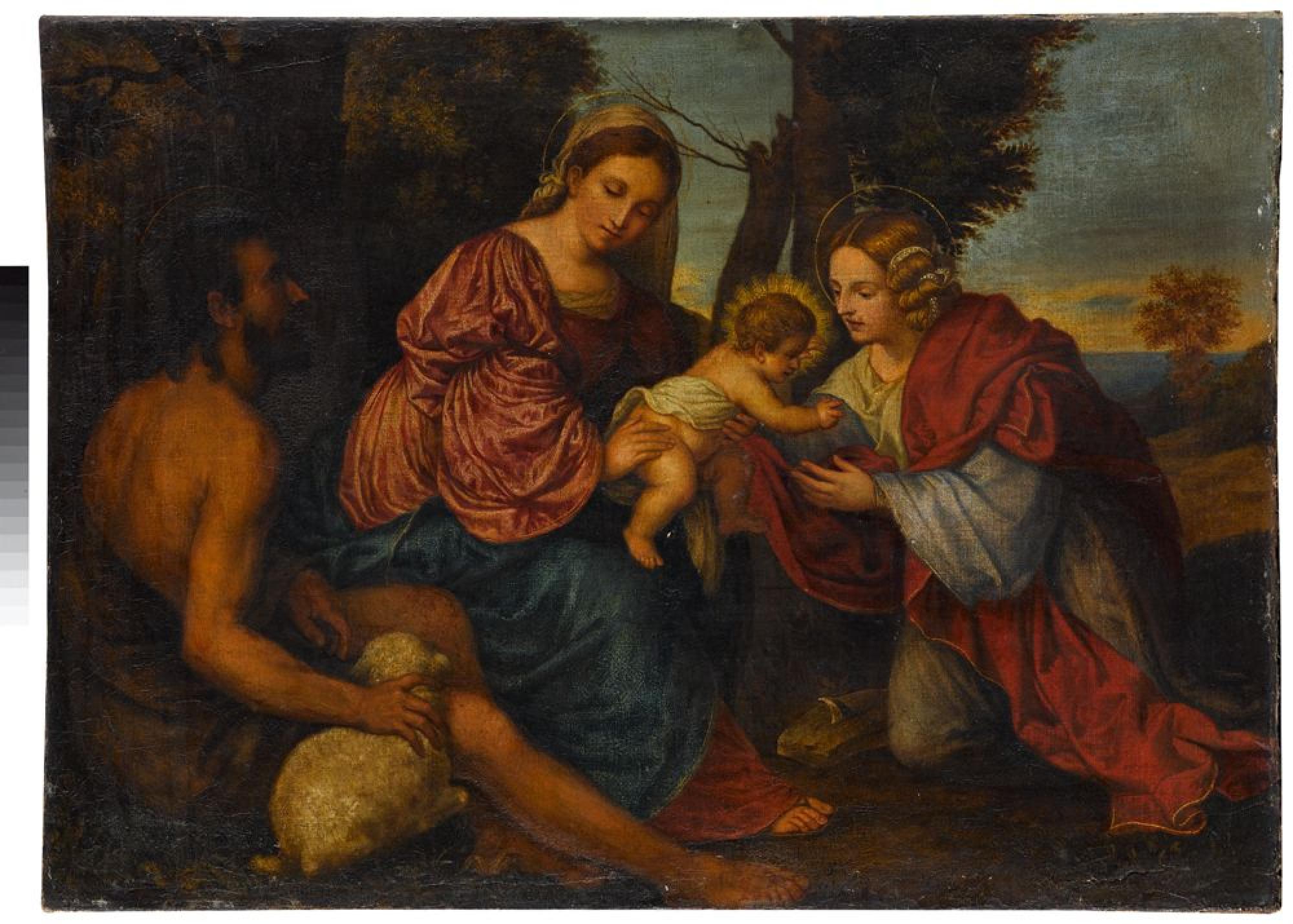 In einer Landschaft hat die Madonna Platz genommen, den Sohn auf ihrem Schoß. Neben ihr sitzt der hl. Johannes der Täufer mit dem Lamm und in einem Gewand aus Kamelhaar, das er der Legende nach als Einsiedler trug. Das Jesuskind neigt sich der hl. Katharina von Alexandrien zu, die als edle Dame mit modisch gebundenem Haar vor ihm kniet. Laut der Legende erschien Jesus der Königstochter und frühchristlichen Heiligen im Gefängnis und vermählte sich mit ihr. Oft wird dazu die Übergabe eines Ringes gezeigt, dies ist hier nicht der Fall. Das Motiv geht auf eine von Tizian (1488/90-1576) entwickelte Variante der Sacra Conversazione, der Unterhaltung zwischen den Heiligen, zurück, die ein klassisches Andachtsbild mit der idyllischen Szenerie einer Pastorale verbindet. Verschiedene Heilige ohne direkten zeitlichen Zusammenhang werden in einer fast genrehaft wirkenden Zusammenführung miteinander verbunden, die eine erzählerische Beziehung zwischen den Figuren erzeugt. In der ersten Hälfte des 16. Jhs. waren solche großformatigen Darstellungen beliebt, auch das Stuttgarter Bild variiert Bilderfindung des venezianischen Malers Tizian, die in Varianten z.B. in Florenz (Palazzo Pitti), London (The National Gallery) und Paris (Musée du Louvre) überliefert ist. Die Komposition wiederholt eine Fassung von Tizian in Edinburgh (National Gallery of Scotland), in der ein nicht identifizierter Heiliger anstelle der Hl. Katharina sich dem Christuskind zuneigt.