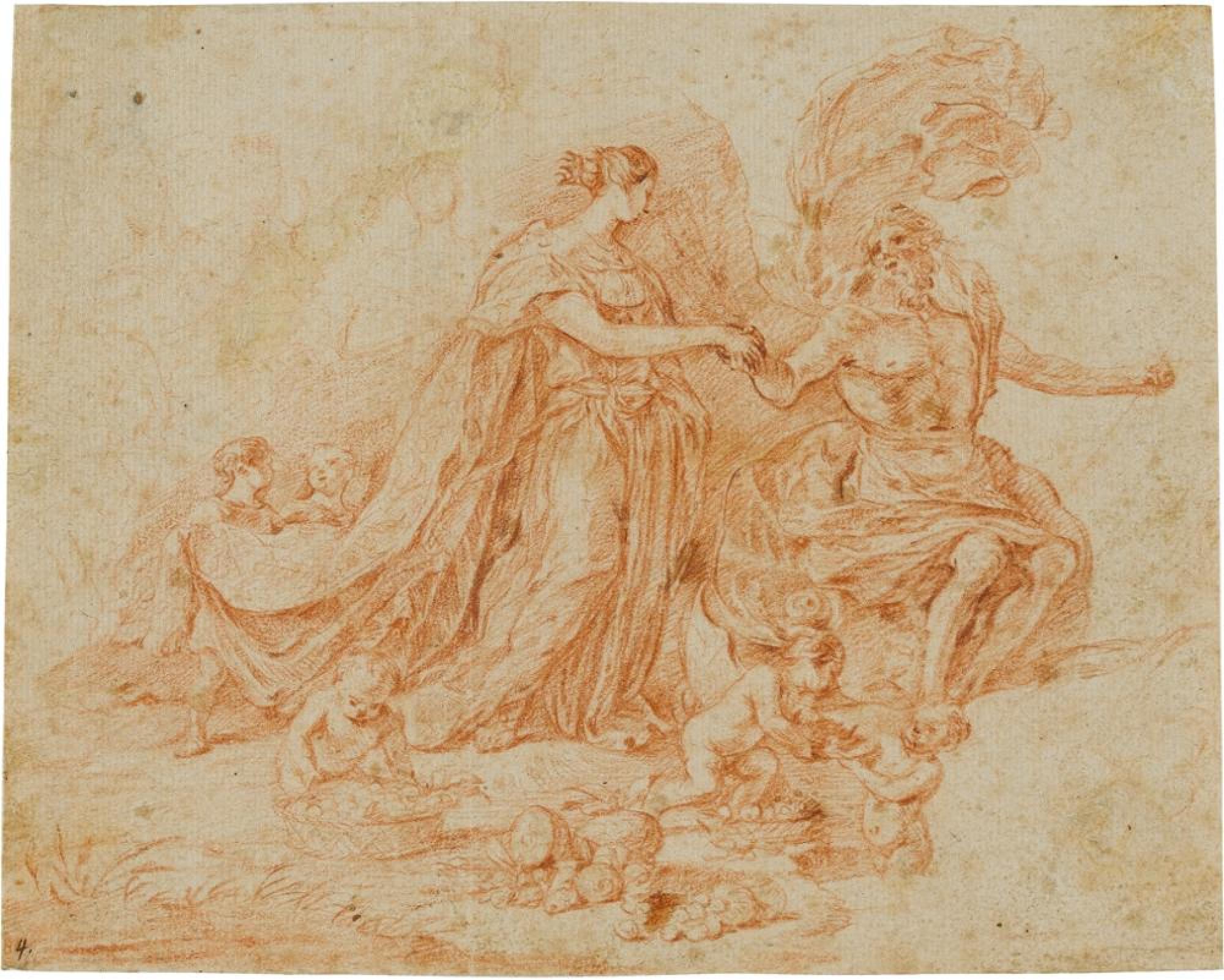 Amphitrite hat dem Liebeswerben von Neptun, dem Gott des Meeres, nachgegeben, und steigt zu ihm in das Muschelboot. Aufgrund des rechtshändigen Zugs der Linien scheidet Schönfeld selbst als Zeichner aus, für den ohnehin keine Kreidezeichnungen gesichert sind. Auch sein Mitarbeiter Gabriel Ehinger arbeitete mit Rötel auf andere Weise (vgl. Inv. Nr. C 502 und Inv. Nr. C 492). Vergleichbar ist das Blatt eher den ähnlich exakt gearbeiteten Rötelzeichnungen von Jonas Umbach, der ebenfalls feste Konturen mit dichtem Strich setzt [vgl. Inv. Nr. C 2000/4612 (KK)]. (Siehe: Bestandskatalog »Deutsche Zeichnungen vom Mittelalter bis zum Barock«. Staatsgalerie Stuttgart, Graphische Sammlung 2007, Nr. 587).