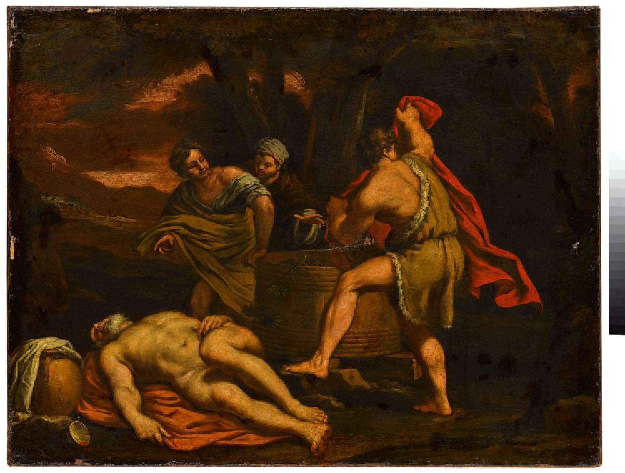 Nackt liegt Noah neben einem großen Weinfass, die leere Schale zu seiner Rechten verrät uns, dass der biblische Stammvater nach übermäßigem Weingenuss eingeschlafen ist. Dabei merkt er nicht, dass seine Scham entblößt ist. Sein jüngster Sohn Ham entdeckt den Vater und ruft seine Brüder Jafet und Sem hinzu. Eindeutig geklärt scheint die dramaturgische Inszenierung des Ereignisses nicht: Während links ein junger Mann auf den Vater weist, dicht gefolgt von einem zweiten, der erstaunt über seine Schulter blickt, tritt rechts ein von uns abgewandter Jüngling hinzu, bereit, den entblößten Vater mit einem roten Tuch zu bedecken. Die Szene wird mit dem Verbot von Nacktheit, aber auch mit der christlichen Rechtfertigung von Sklaventum verbunden; denn aus Wut über Ham, der seinen Brüdern von der Trunkenheit des Vaters berichtete, verdammt Noah ihn, seinen Brüdern zu dienen. Der bärtige Noah ist als raffiniert verkürzte Aktfigur gezeigt und weckt wenig Erinnerungen an einen Rausch. Das Bild wird in Neapel in der Nachfolge von Luca Giordano (1634-1705) entstanden sein, der für derartige dramatische Inszenierungen von Körpern und Geschichten bekannt war und die Maler in Neapel nachhaltig geprägt hat.