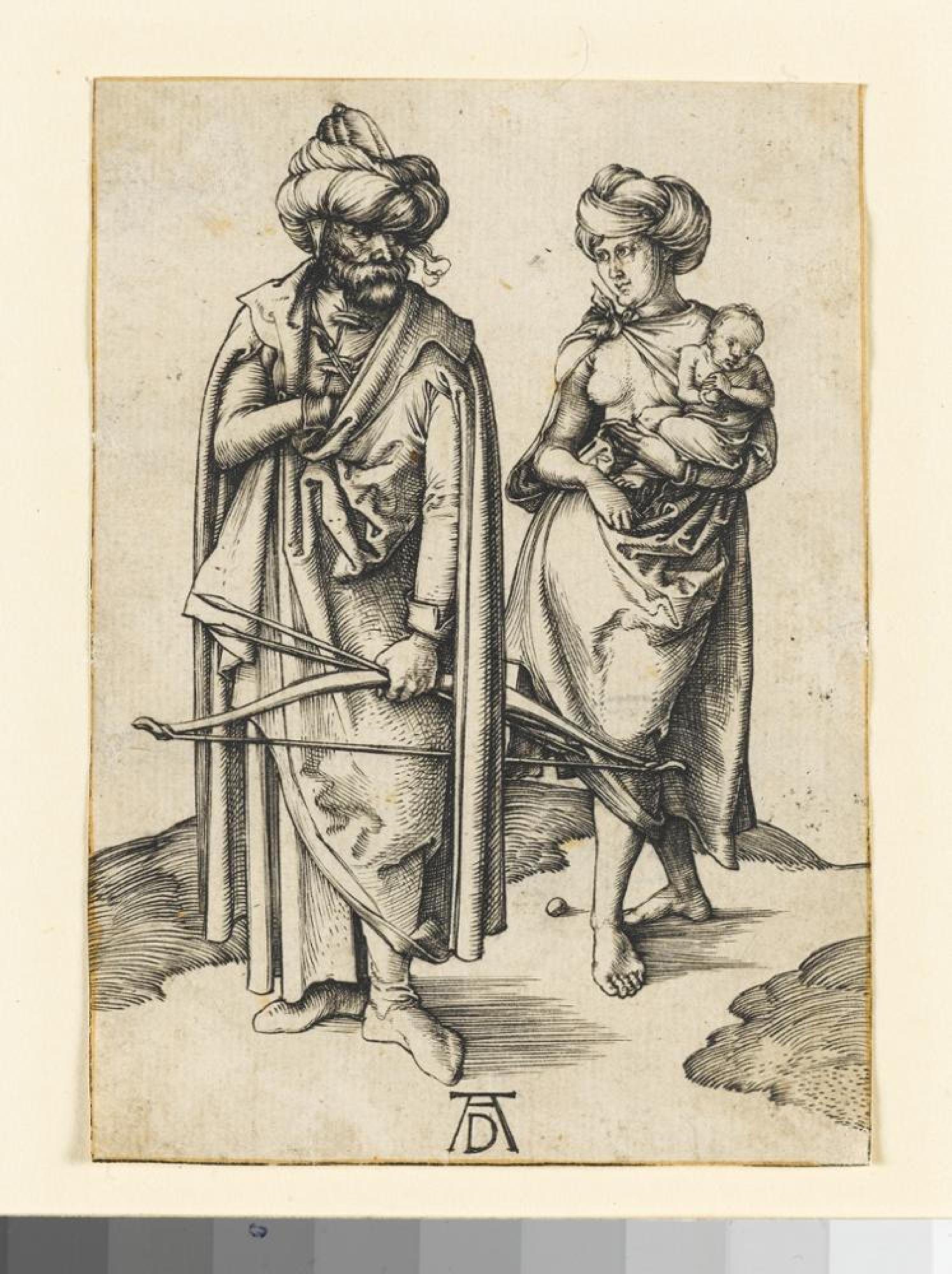 Dürers früher Kupferstich trägt traditionell die Bezeichnung »Türkenfamilie«. Der Mann hat zwar einen türkischen Bogen mit zwei Pfeilen, doch die Frau trägt keine türkische Kleidung. Dargestellt sind Roma (»Zigeuner«), die als Nomaden aus dem Osmanischen Reich vertrieben wurden und im 15. Jahrhundert in Mitteleuropa einwanderten. Die Diffamierung als Diebe und Landstreicher geht auf diese Zeit zurück. Das Interesse an dem fremden Volk, seiner Tracht und Lebensweise äußerte sich schon in einem um 1480 entstandenen Kaltnadelstich des Hausbuchmeisters (Meister des Amsterdamer Kabinetts), von dem zu Dürers Zeit Kopien auf dem Markt waren. Auch aus Dürers Bild spricht sachliches Interesse und in der Darstellung der Frau mit dem Kind auf dem Arm sogar Sympathie. [HMK] Ausstellung: »Albrecht Dürer und Lucas van Leyden. Kunst und Leben um 1500«, 2015/16