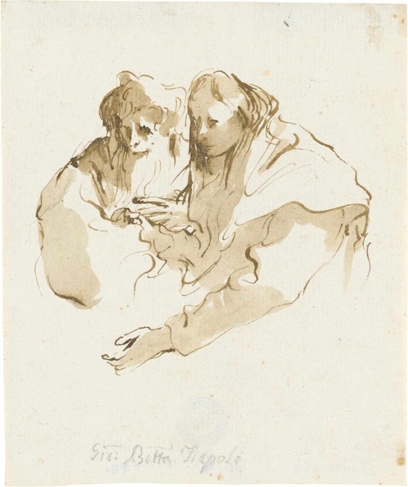 Die Studie ist der Stuttgarter Zeichnung »Gruppe von Orientalen« (Inv. Nr. C 1420) eng verwandt und gehört zu einer ganzen Gruppe von Blättern, die zum Teil während der Würzburger Zeit sowie in Verbindung mit der Ausmalung der Villa Valmarana ai Nani bei Vicenza 1757 stehen (vgl. Inv. Nr. C 1425, C 1434, C 1435; vgl. George Knox: Catalogue of the Tiepolo Drawings in the Victoria & Albert Museum, London 1960, Nr. 131-176, 276-295). Stets ist der Federstreich leicht und spontan, die Lavierung unterstreicht das Atmosphärische, das gerade der venezianischen Zeichenkunst im Besonderen eignet. Fast alle Tiepolo-Zeichnungen in der Staatsgalerie stammen aus der Sammlung Bossi-Beyerlen. Diese ehemals rund 850 Zeichnungen umfassende Sammlung, einst von dem Mitarbeiter Giovanni Domenico Tiepolos (1727-1804), Giovanni Domenico Bossi (1765-1853), zusammengetragen und durch die Heirat seiner Tochter Maria Theresa Karoline (1825-1881) mit Karl Christian Friedrich Beyerlen (1826-1881) in dessen Besitz gelangt, wurde 1882 in Stuttgart bei Gutekunst versteigert. Der damalige Kustos des Königlichen Kupferstichkabinetts Stuttgart, Karl August Kräutle (1833-1912), erwarb dort insgesamt neun Konvolute mit 105 Kreide- und 63 Federzeichnungen der Tiepolo.