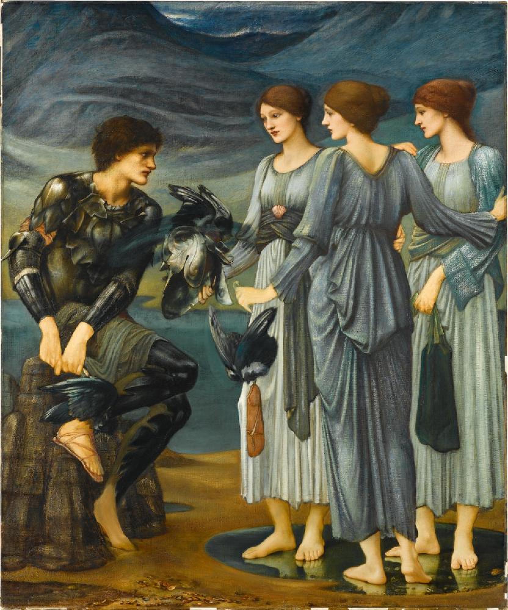Die Meernymphen statten Perseus mit weiteren magischen Gegenständen aus: dem Helm des Hades, der seinen Träger unsichtbar macht, den Flügelschuhen des Götterboten Hermes und einem Beutel. In ihm wird Perseus das Haupt der Medusa aufbewahren. Die Darstellung der drei Meernymphen verbindet das Vorbild antiker Skulpturengruppen der drei Grazien mit dem Stil italienischer Renaissancemalerei. Perseus ist damit beschäftigt, sich die Flügelschuhe umzubinden. Seine Pose verrät das Vorbild von Michelangelos Jünglingsakten aus dem Deckenfresko der Sixtinischen Kapelle. »Perseus und die Meernymphen« ist eines der letzten Bilder, an denen Burne-Jones vor seinem Tod arbeitet. 1897 wendet er sich dem Gemälde nach 20-jähriger Pause erneut zu und malt es in weiten Teilen neu. Bei seinem Tod bleiben nur wenige Details, vor allem an Händen und Füßen, unausgeführt. Edward Burne-Jones (1833–1898) gilt als der bedeutendste Vertreter der zweiten Generation der Präraffaeliten, der einflussreichsten Kunstströmung des Viktorianischen Zeitalters. 1875 erhält er den Auftrag, das Empfangszimmer im Londoner Anwesen des späteren britischen Premierministers Arthur James Balfour (1848–1930) mit einem Wandzyklus auszustatten. Bei der Umsetzung ist er an keine inhaltliche Vorgabe gebunden und wählt als Thema den antiken Perseus-Mythos. Seine literarische Vorlage ist das epische Gedicht »The Earthly Paradise« (»Das irdische Paradies«) von William Morris (1834–1896). Morris ist Textildesigner, Dichter, Romancier, Übersetzer und sozialistischer Aktivist. Als Freund und Geschäftspartner inspiriert er Burne-Jones zu zahlreichen seiner wichtigsten Arbeiten. Das achte Kapitel von »The Earthly Paradise« handelt von den Abenteuern des Halbgottes Perseus, des Sohnes. von Danae und Zeus. Teile des achtteiligen Zyklus bleiben unvollendet. 1971 gelangt er aus New Yorker Privatbesitz in die Staatsgalerie.