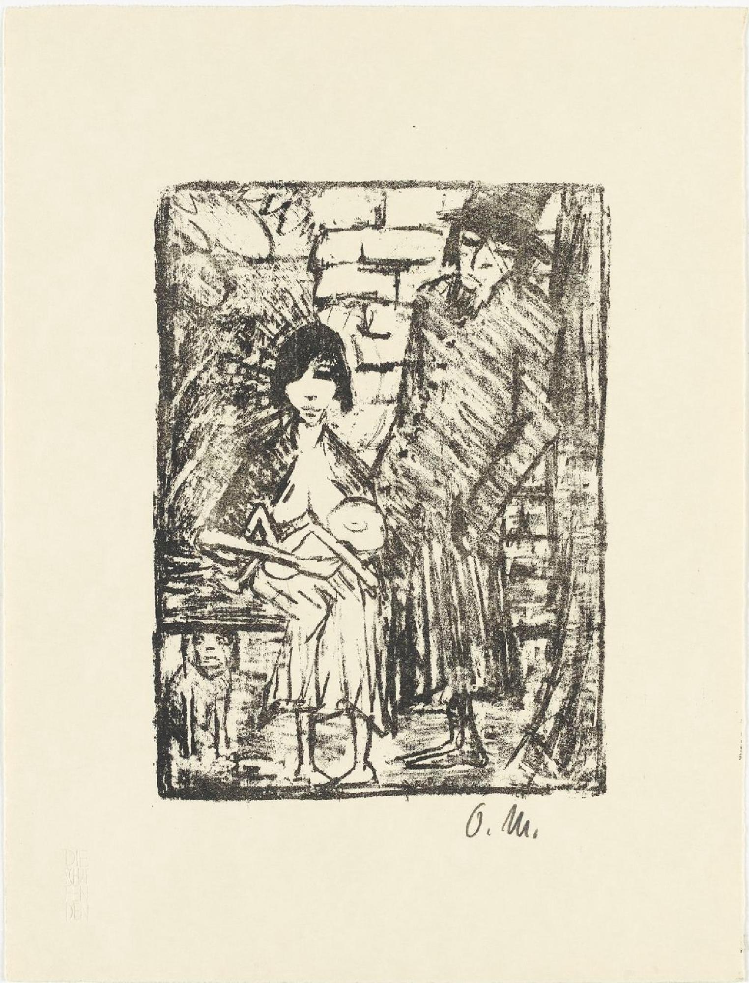 Der in Liebau (heute Lubawka) in Polen geborene Otto Mueller, dessen zentrales Thema die Einheit von Mensch und Natur ist, inszeniert seine jüdische, polnische Familie in dieser Lithographie wie eine Heilige Familie. »Die Schaffenden. Eine Zeitschrift in Mappenform« erschien mit acht Jahrgängen in fünf Mappen mit insgesamt 220 Holzschnitten, Radierungen, Lithographien und Linolschnitten von 1918 bis 1922 im Gustav Kiepenheuer Verlag in Weimar, von 1923 bis 1930 im Euphorion Verlag in Berlin. Der Herausgeber Paul Westheim ergriff in den »Schaffenden« die Chance, neben »Spitzenwerken« unbekanntere Positionen des frühen 20. Jahrhunderts speziell in der Graphik dem Publikum nahe zu bringen und deren Entwicklung und »Schaffen« rund dreizehn Jahre lang zu begleiten. An dem ehrgeizigen Projekt waren Künstler aus Deutschland, Frankreich, Tschechien, Österreich, Ungarn und der Schweiz beteiligt.